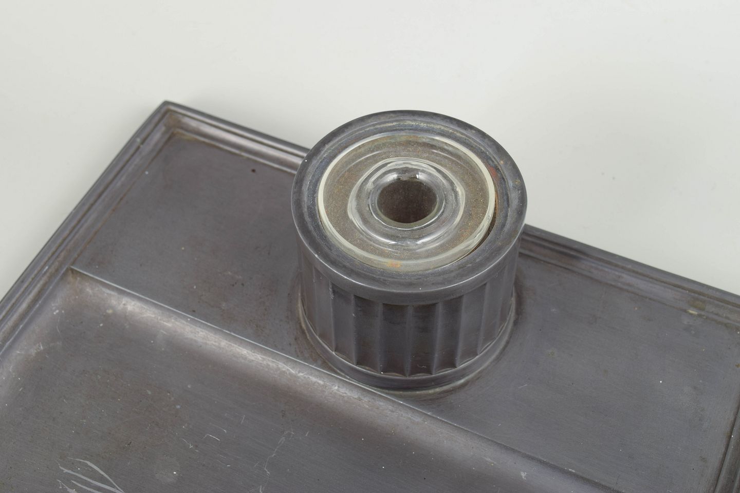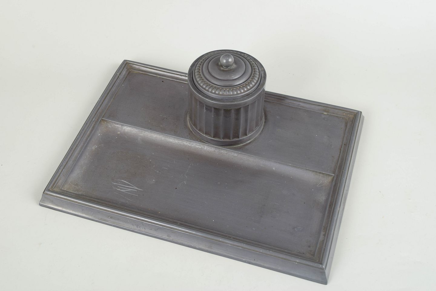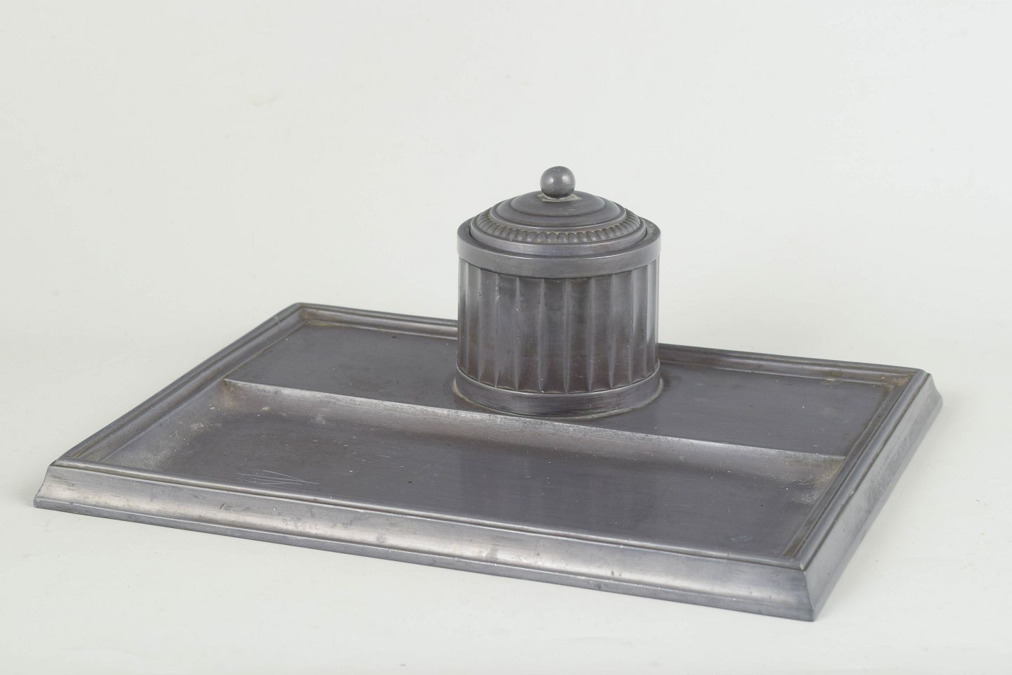 Blækhus i tin med rektangulær bakke, cylindrisk beholder med riflet dekoration og låg samt original glasindsats. Model D36.