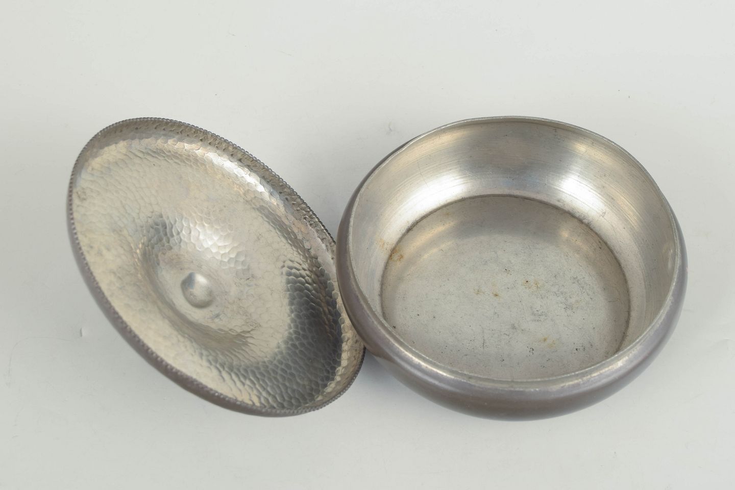 Art deco lågskål i tin med rund, blød form og låg afsluttet med dekorativ figur som knop.