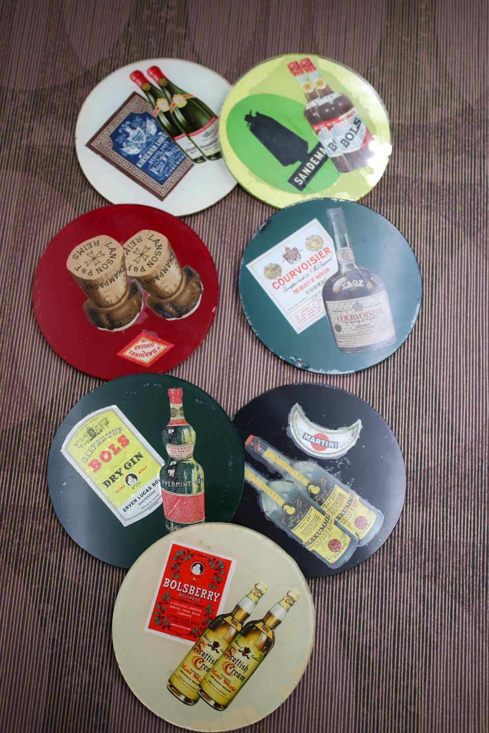 7 gamle drinks glasbakker med motiver af div. spiritus og likør mærker.