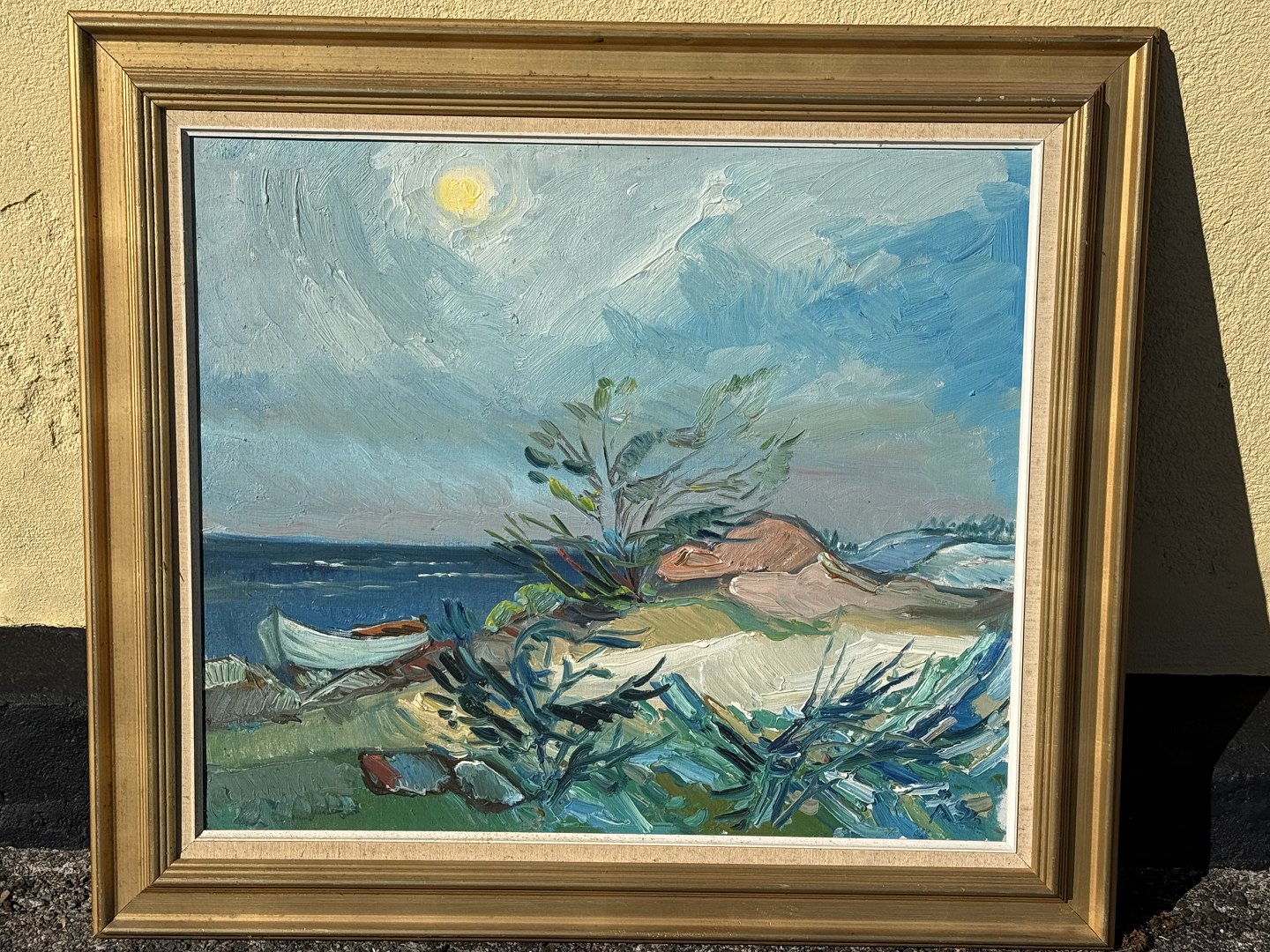 Aage Strand (1910-1975), oliemaleri på lærred, Båd ved strand, Signeret Å.S., mål med ramme 88x78cm *Fin stand*