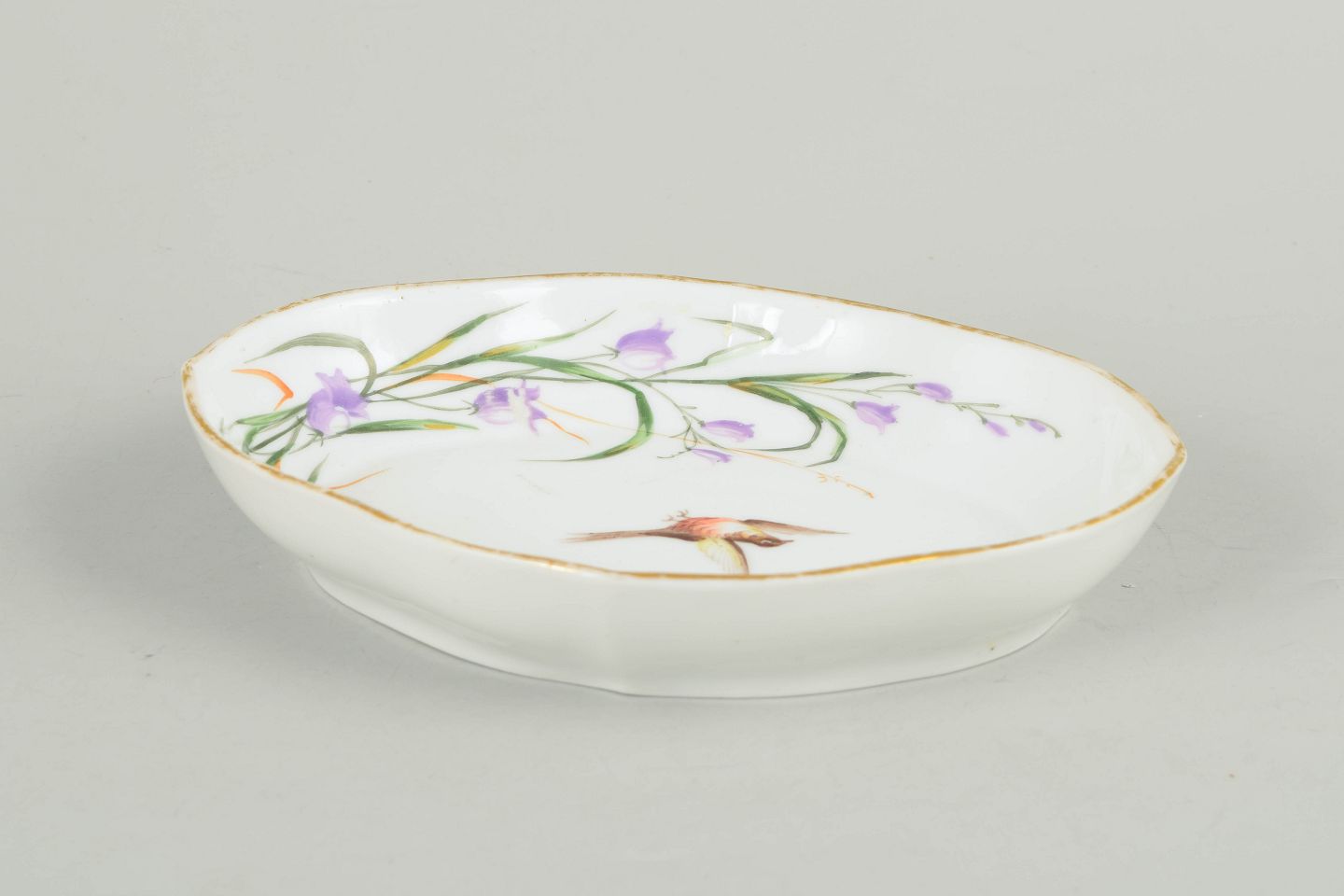 Antikt ovalt fad i håndmalet porcelæn med centralt fuglemotiv og blomsterdekoration i lilla og grønne nuancer, afsluttet med guldkant langs randen.