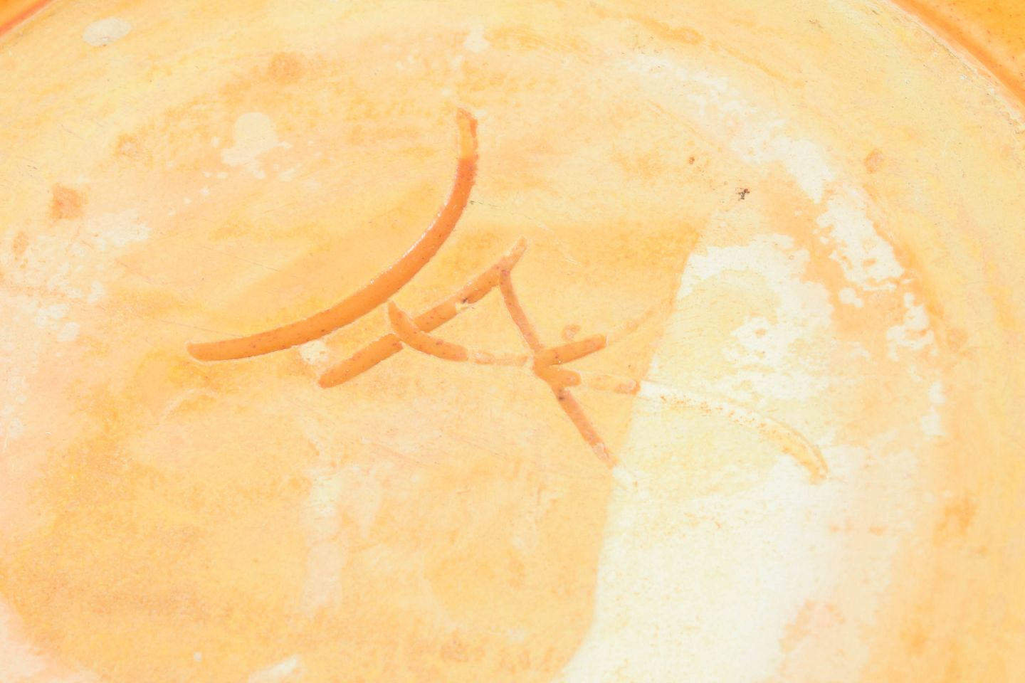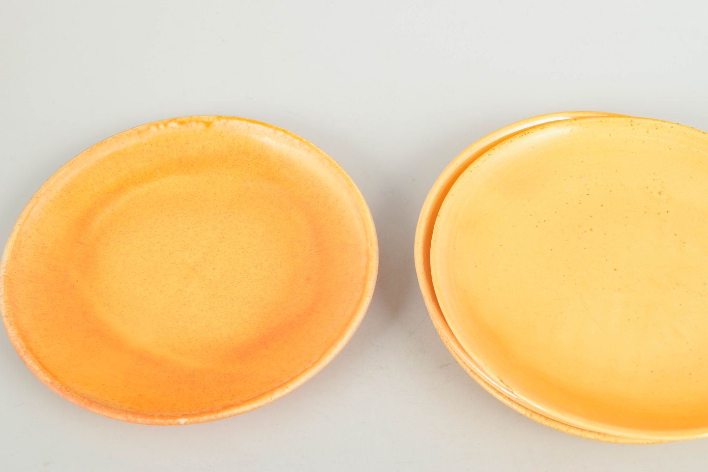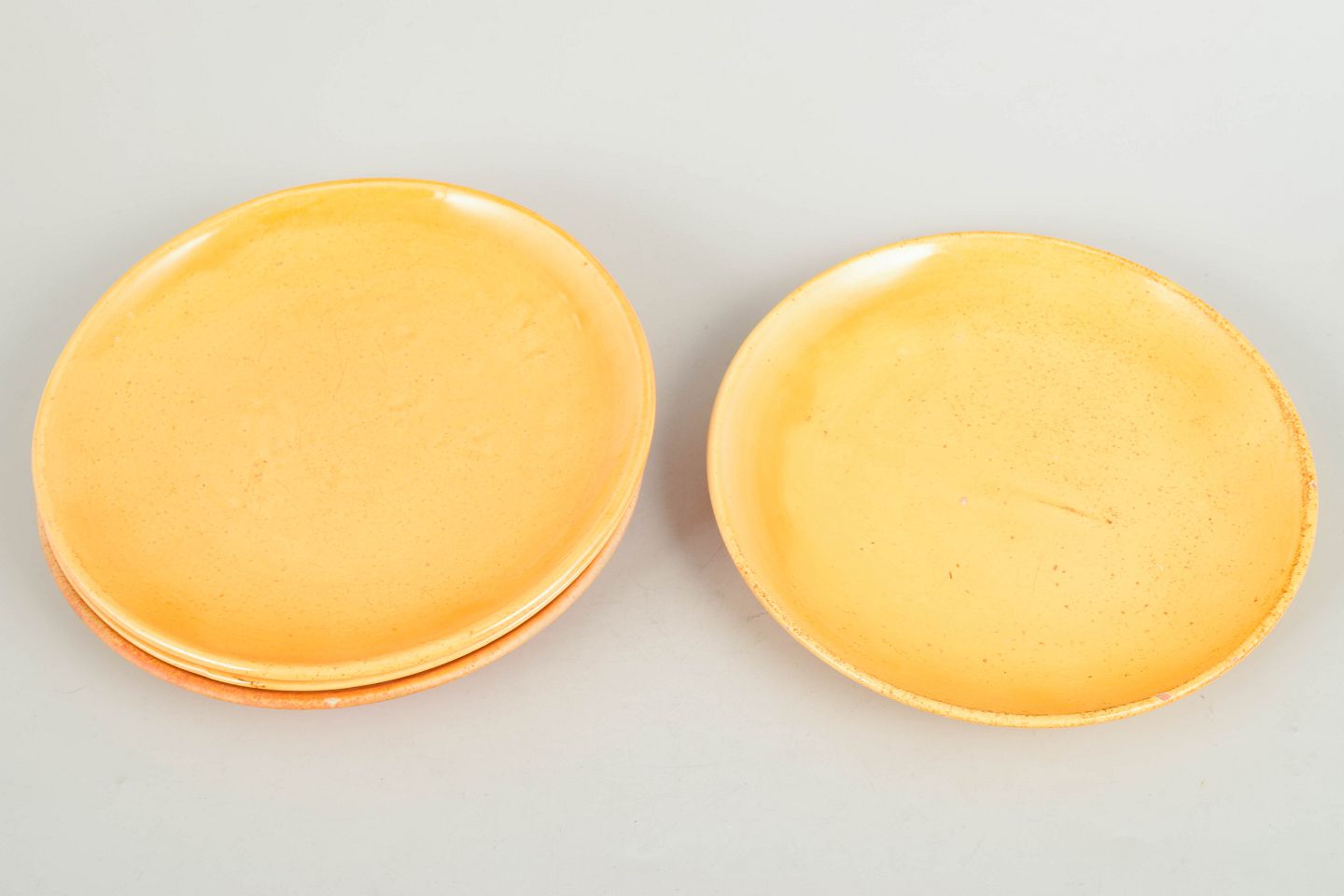 Fire keramiske tallerkener med uranholdig glasur i varme gyldne toner, fremstillet hos Kähler i 1930’erne.
