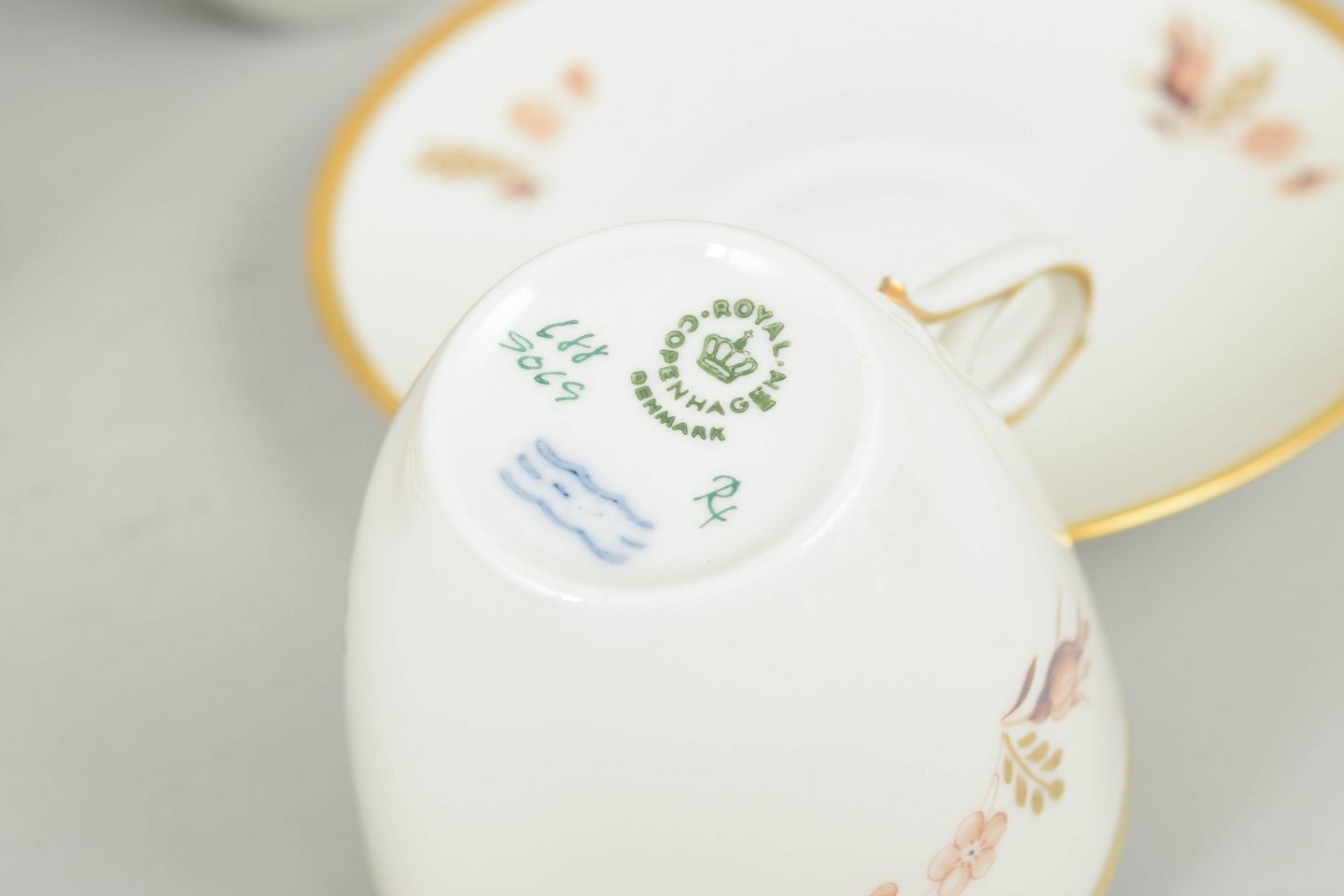 Kaffekopper med tilhørende underkopper i hvidt porcelæn med brun blomsterdekoration og guldkant, model 688/9069, fra 1970’erne, første sortering.