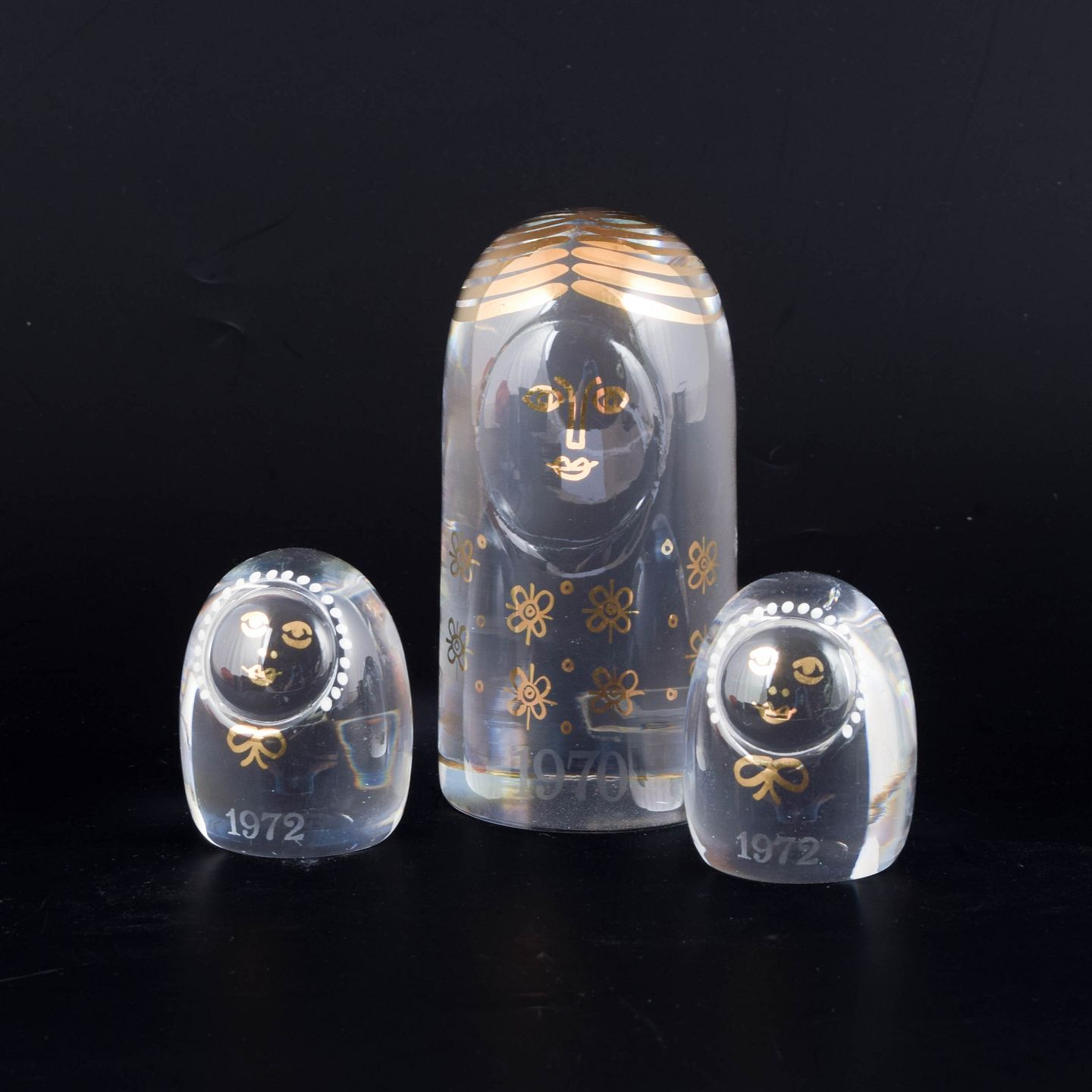 Håndlavede kunstglasfigurer i klart glas med stiliserede ansigter og dekorative hvide og gyldne blomstermotiver, udført som en mindre familiegruppe.