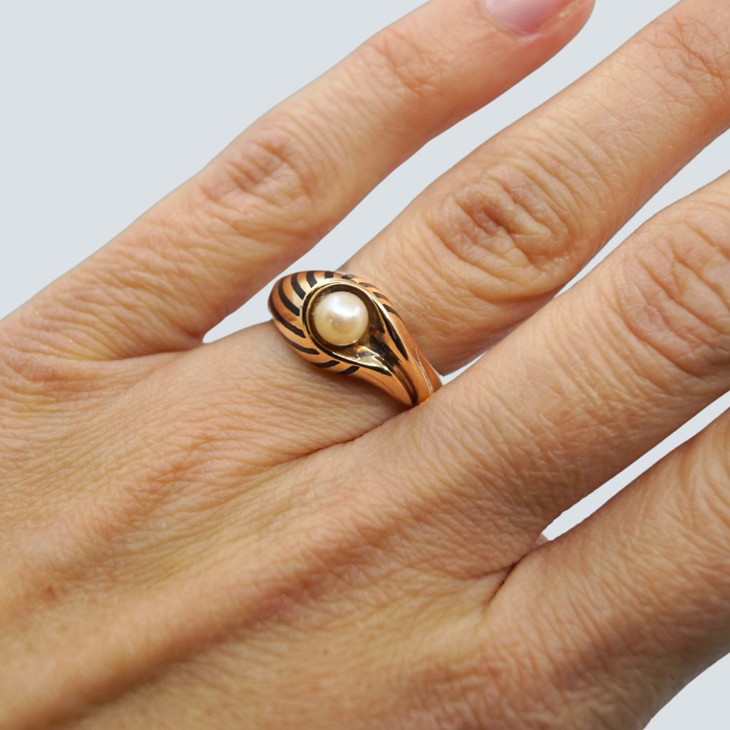 Bernhard Hertz; Ring i 14 kt. guld med emalje og perle.