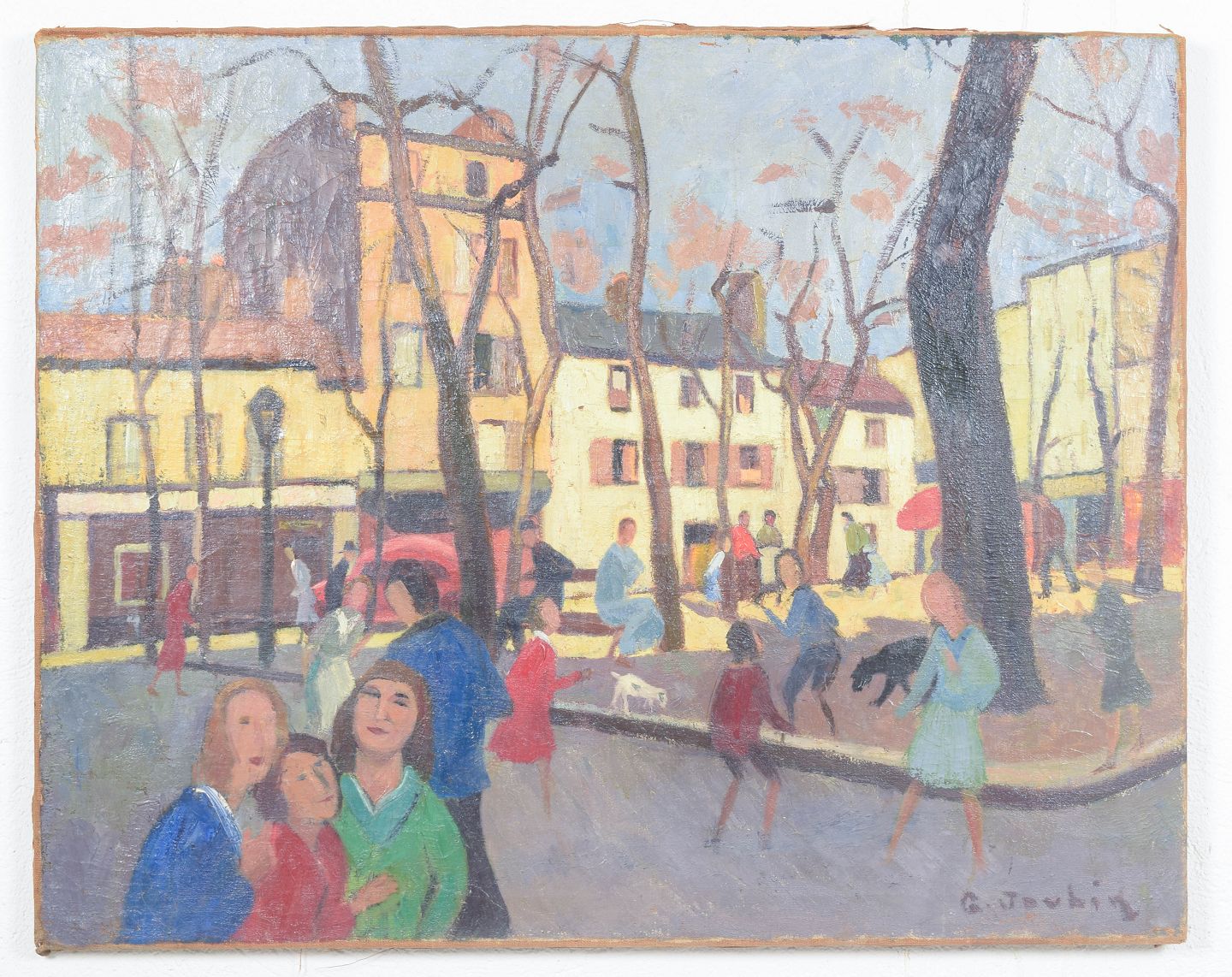 Motiv fra Place du Tertre i Montmartre med figurer, bygninger og træer gengivet i en tidlig modernistisk stil med flade farvefelter og dekorativ komposition. Maleriet er signeret og fremstår med en klar og farverig billedopbygning karakteristisk for kunstnerens arbejde fra 1930’erne–1940’erne.