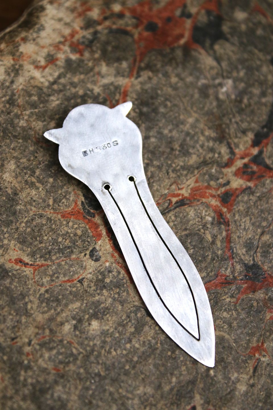 Gammelt bogmærke i sølv i form af en lille ugle med grønne glas øjne. Stemplet 830s. Længde: 5,8cm.