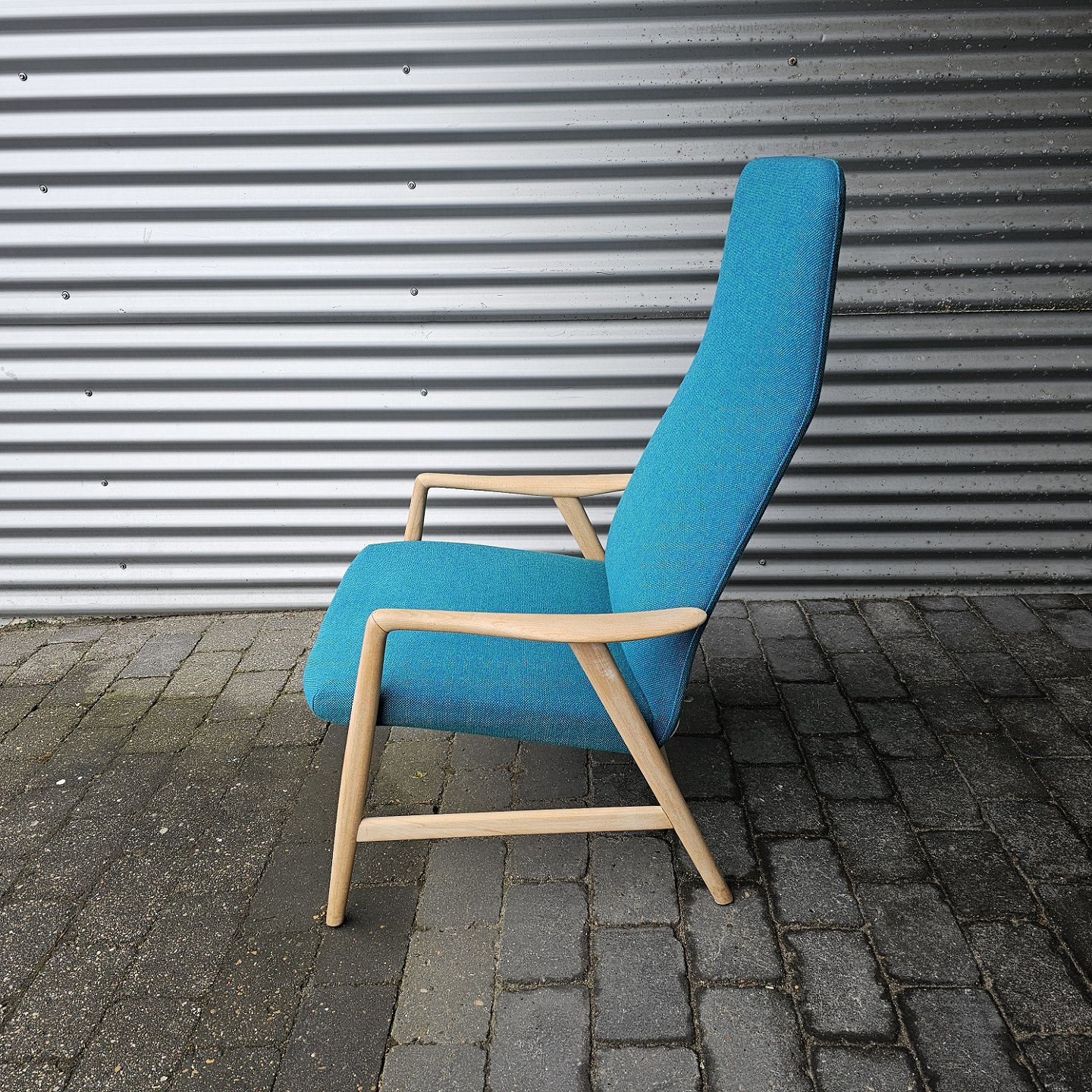 Sæt af to lænestole med træstel og sæde betrukket i blå Hallingdal uld