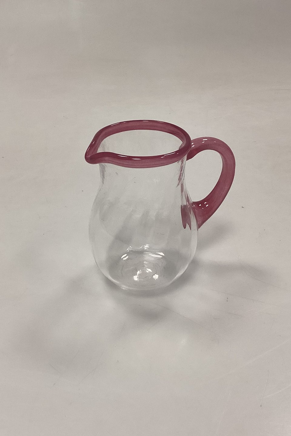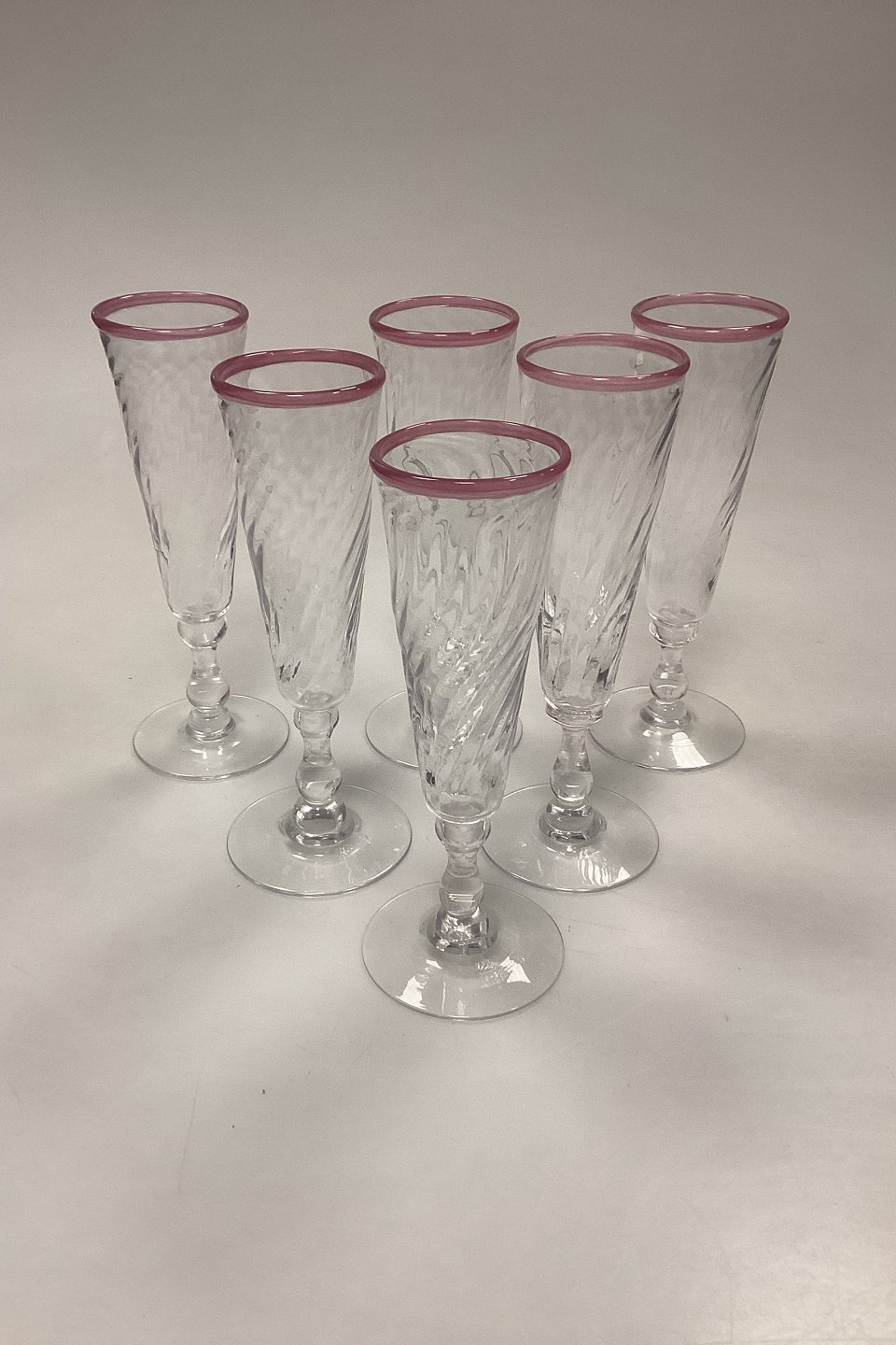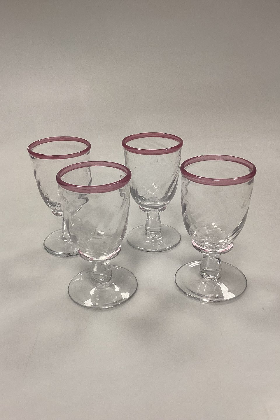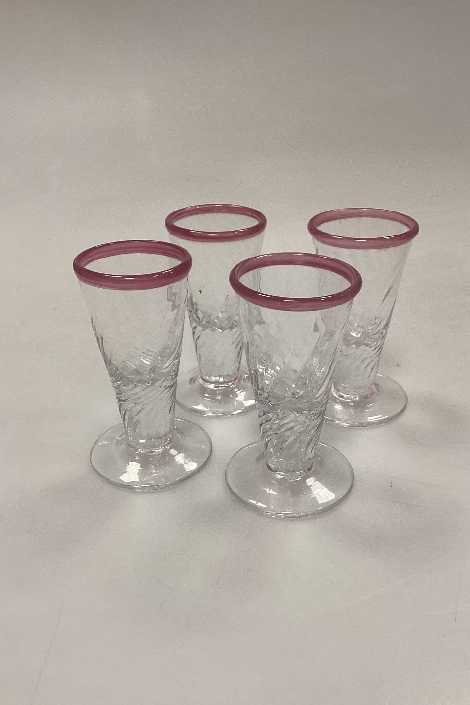 Large set of handmade glasses of 24 pieces. Clear glass with twisted optics and pink rim.