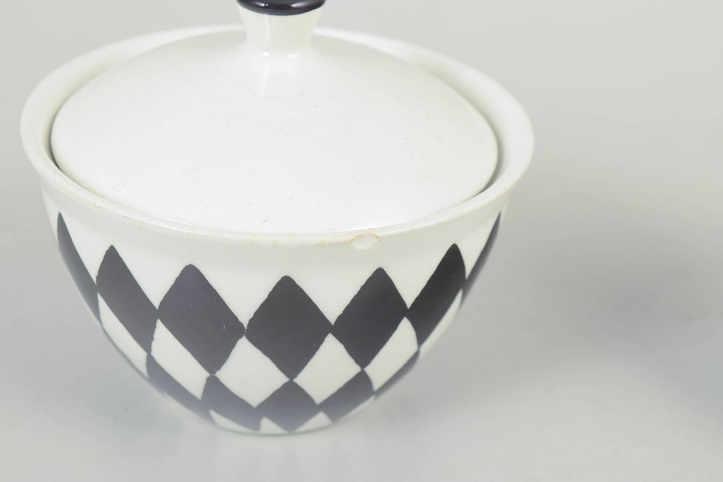 Set consisting of lidded sugar bowl and creamer in porcelain with a distinctive black diamond pattern, designed in a simple and functional style typical of the period.