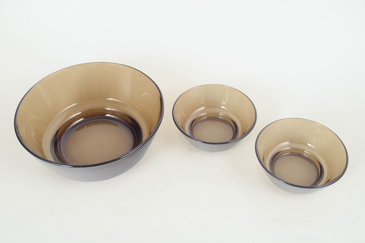Sæt bestående af to små og én stor skål i presset glas med let konisk form og røgfarvet toning, fremstillet i Frankrig og mærket fra producenten.