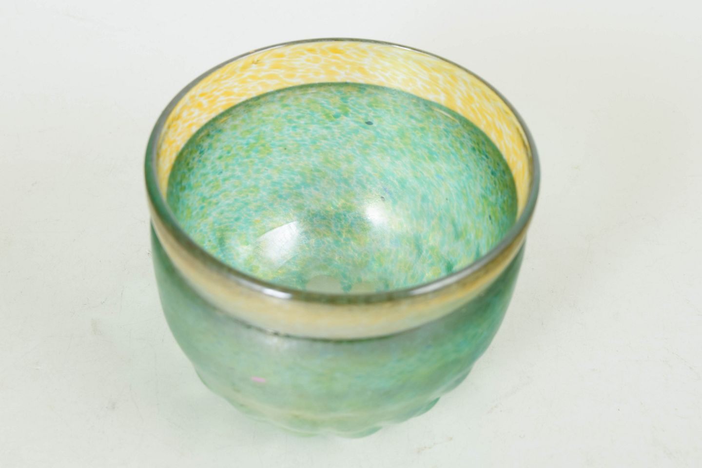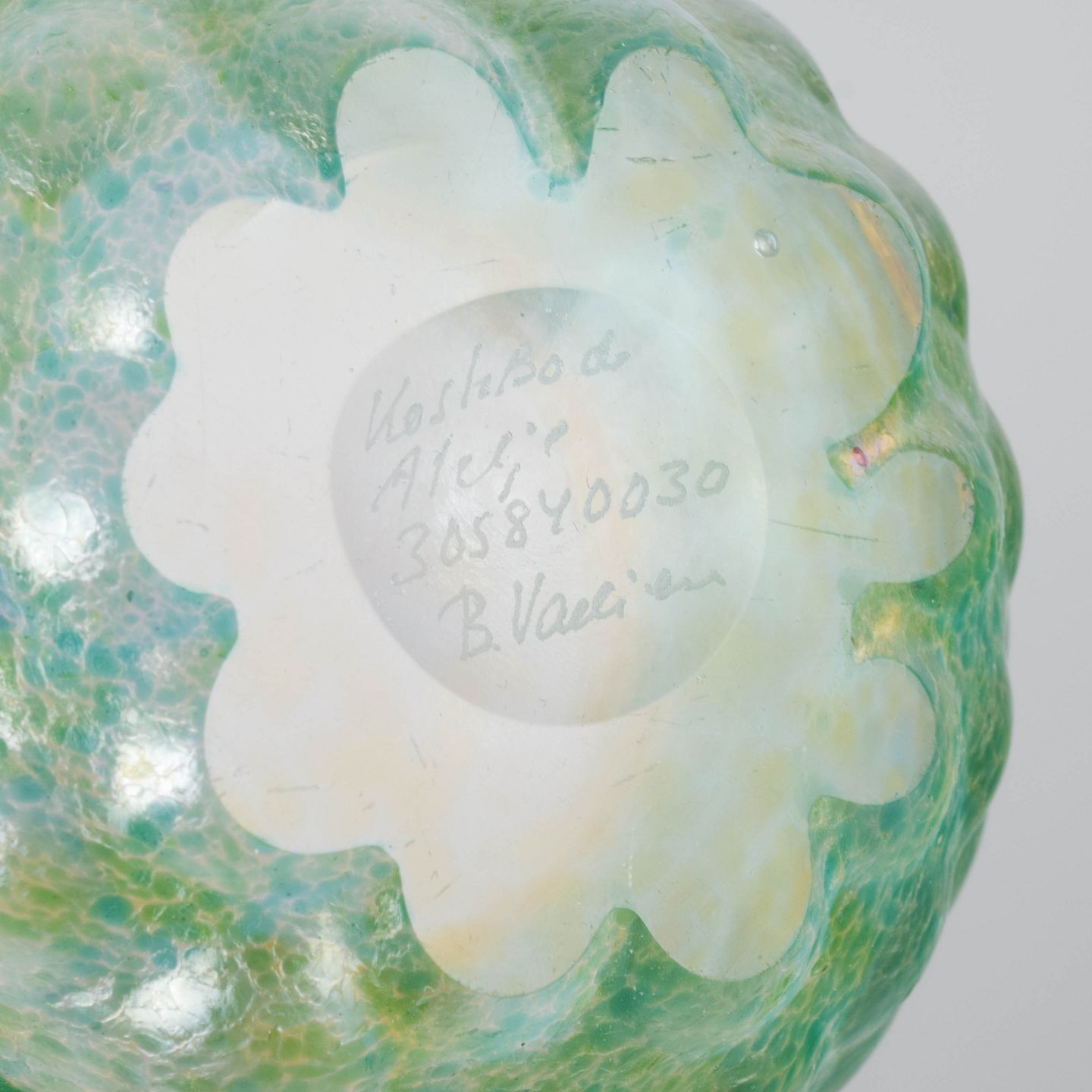 Mundblæst glasskål med organisk form og iriserende overflade i grønne og gyldne nuancer samt dekorativt indfanget mønster, signeret under bunden.