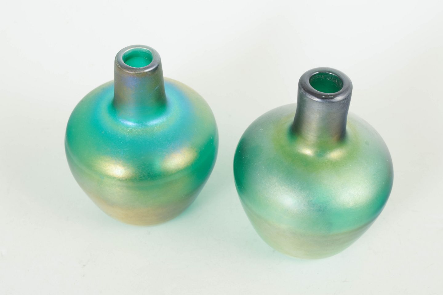 Elegant mouth-blown glass vases with organic form and iridescent surface in green and golden tones that shift in the light.