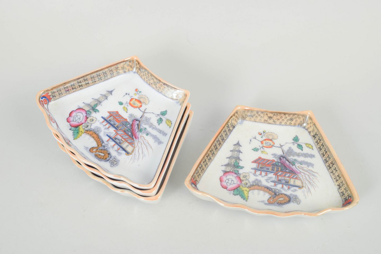 Dekorative firkantede fade i fajance med polykrom dekoration i orientalistisk japansk stil med pagodemotiv, fugl og blomster. Model Japan, produceret i perioden 1866–1925 og dateret til 1880’erne.