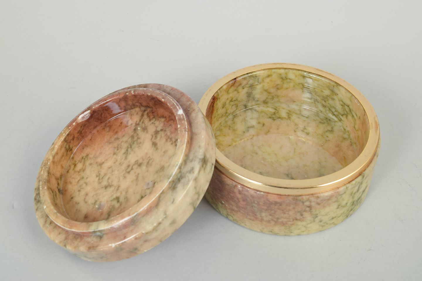 Rund æske med låg udført i alabast med smukt flerfarvet åretegning i rosa, grønne og beige nuancer. Afsluttet med et fint bånd i messing, der tilfører et raffineret art deco præg.