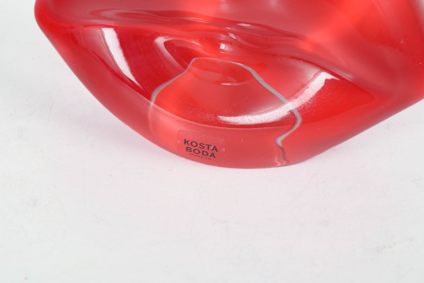 Skulpturel form som læber udført i massivt rødt glas med bløde organiske linjer og transparent effekt.