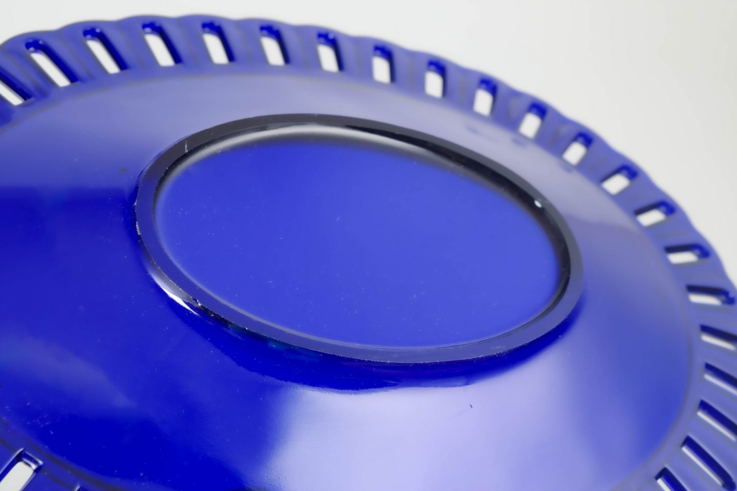 Elegante pressede glas tallerkener i dyb koboltblå farve med karakteristisk gennembrudt rand i filigranarbejde. Et markant eksempel på svensk glasdesign fra midten af det 20. århundrede.