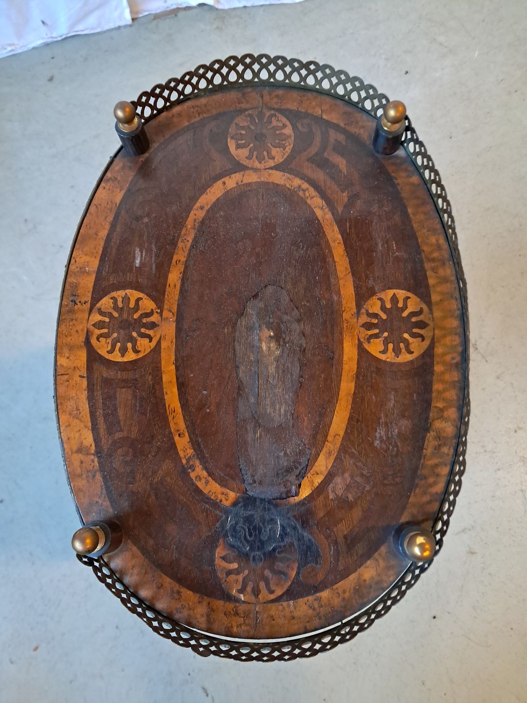 Sidebord i fineret mahogni og nødetræ med metalkant, fra 1980erne.