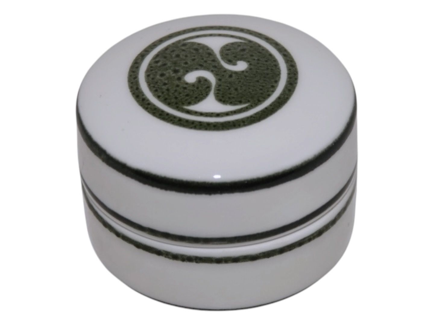 Royal Copenhagen kunstporcelæn, lille lågkrukke med grøn dekoration designet af Alev Siesbye.