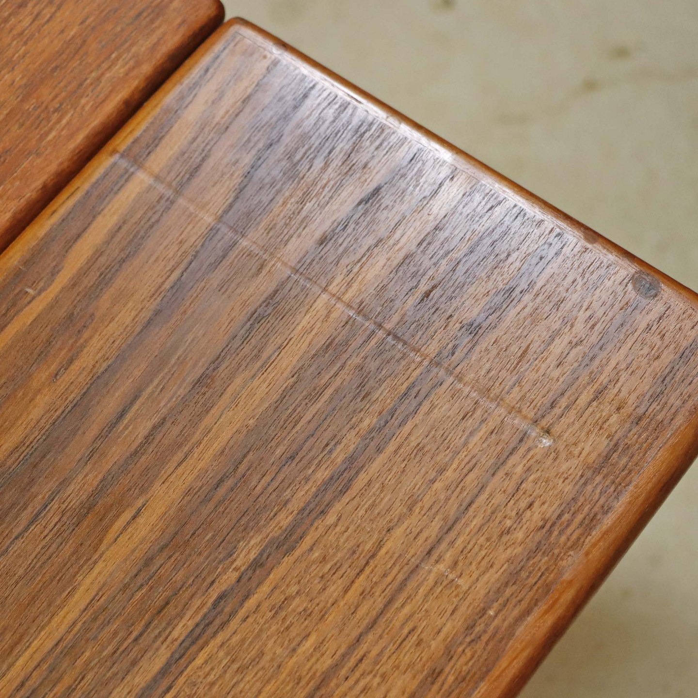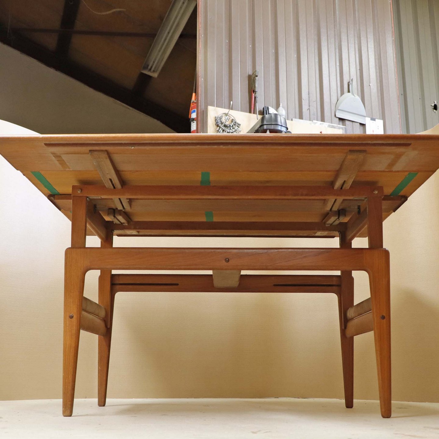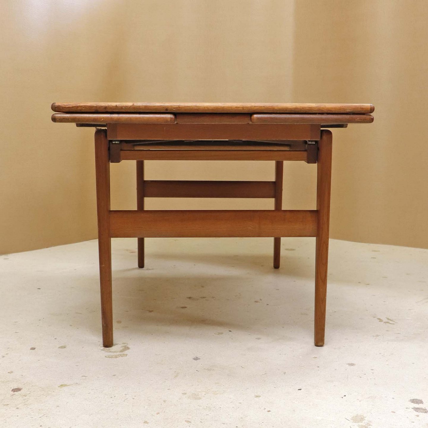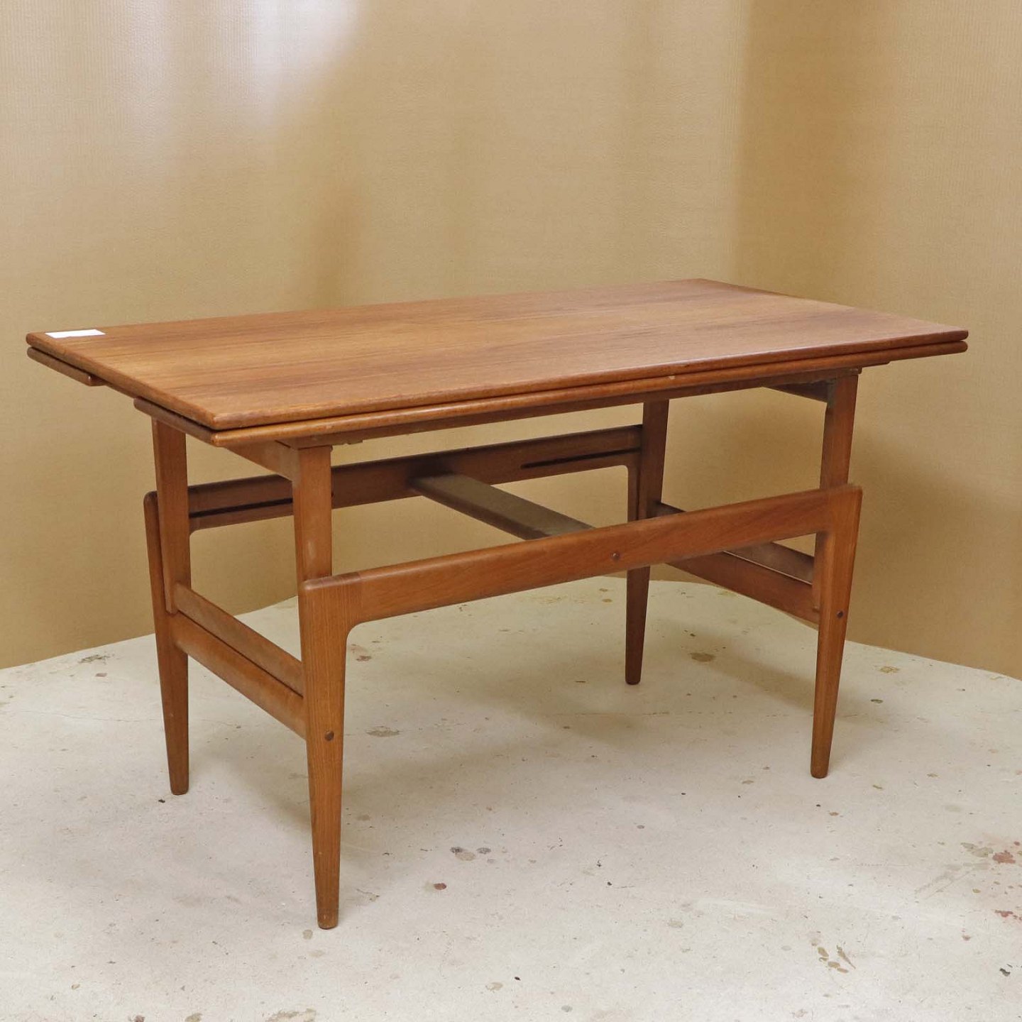 Sofa- og spisebord i samme møbel. Bordet er fremstillet i teaktræ og har to underliggende udtræksplader, som befinder sig på hver af bordets lang-sider.