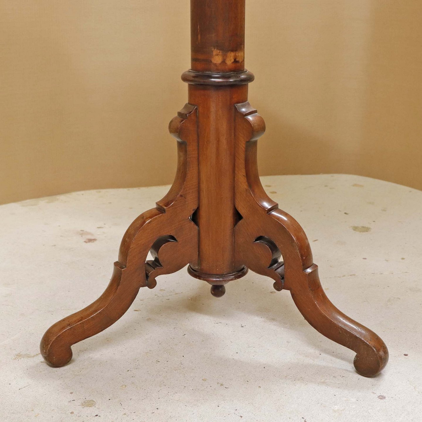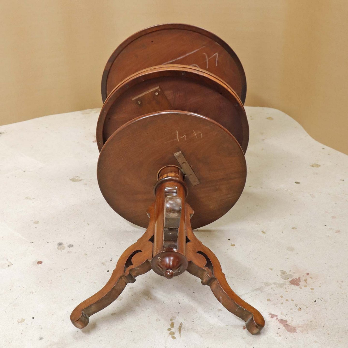 Et ældre serveringsbord på tre fødder i lakeret maghoni med tre etager. Opsatsdelen kan slås sammen til et bord.