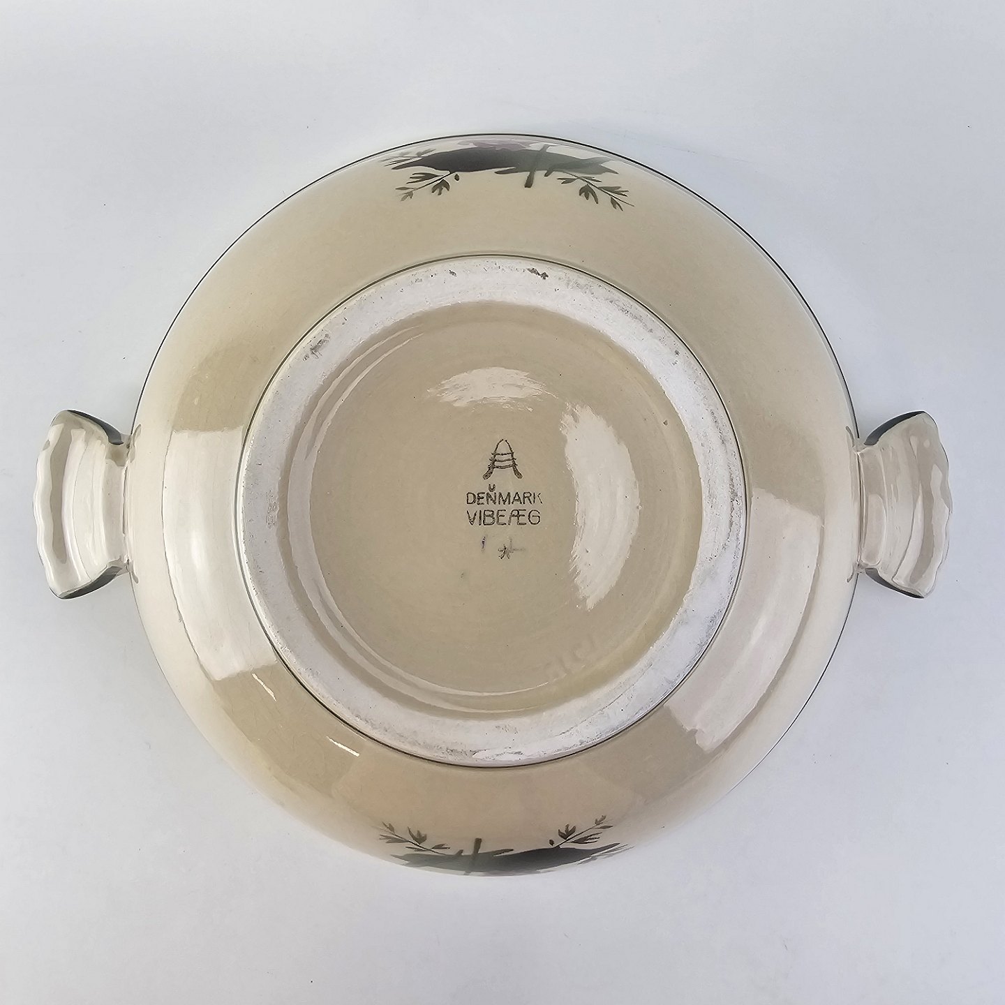 Fajancestel i stelform Viktoria II (Fletværk) med flettet kant og dekoration af en vibeæg blomst i violet og grøn, fremstillet i perioden 1934-1967