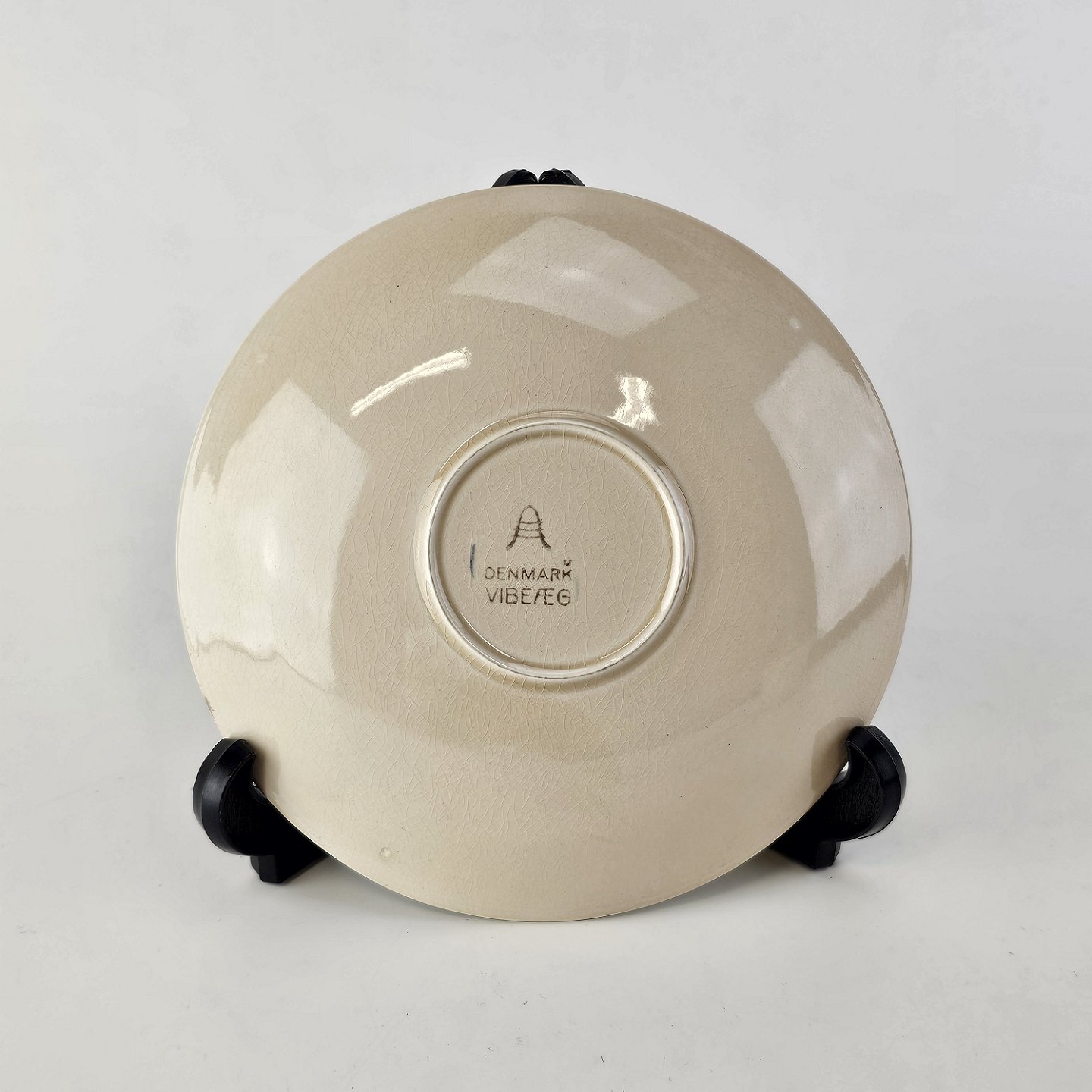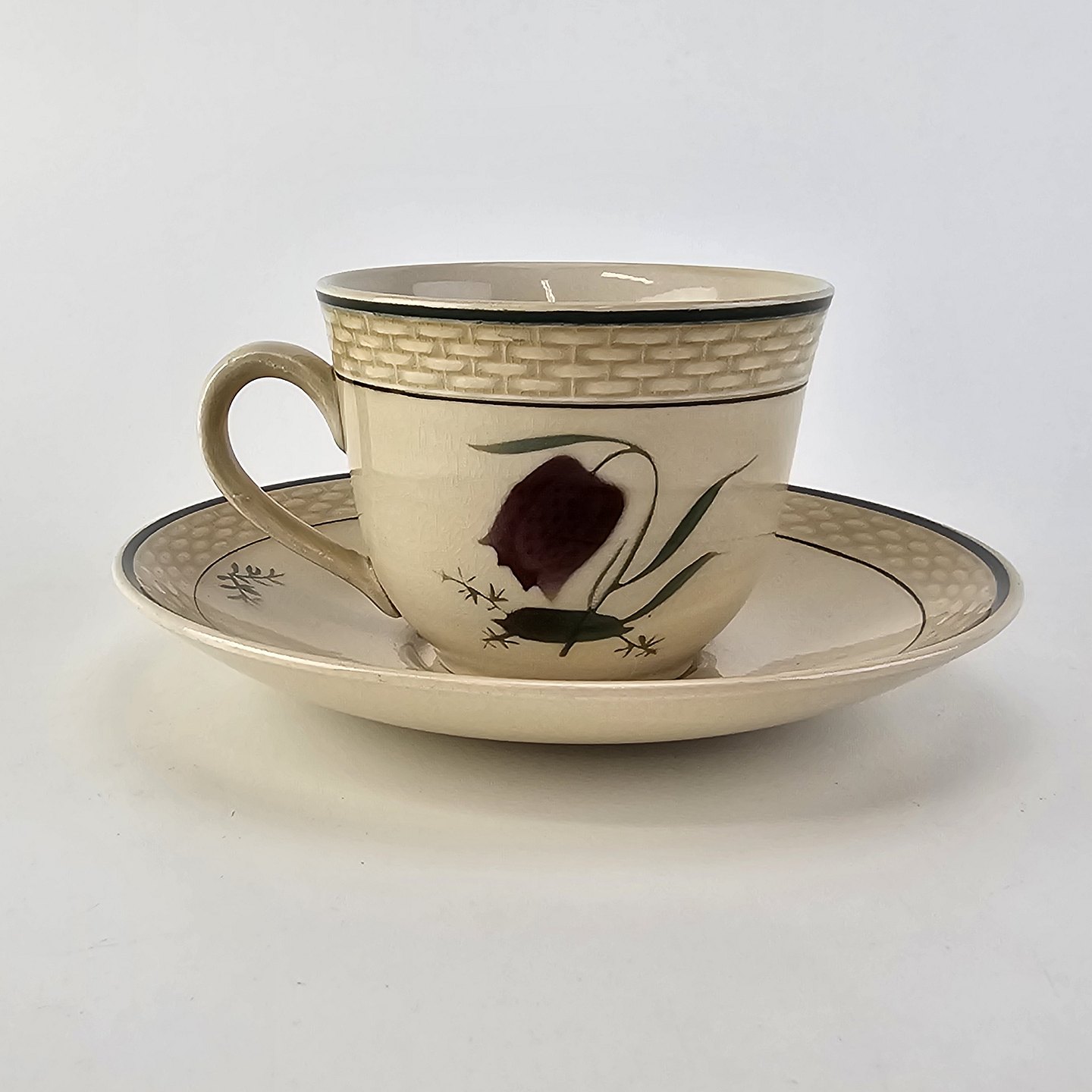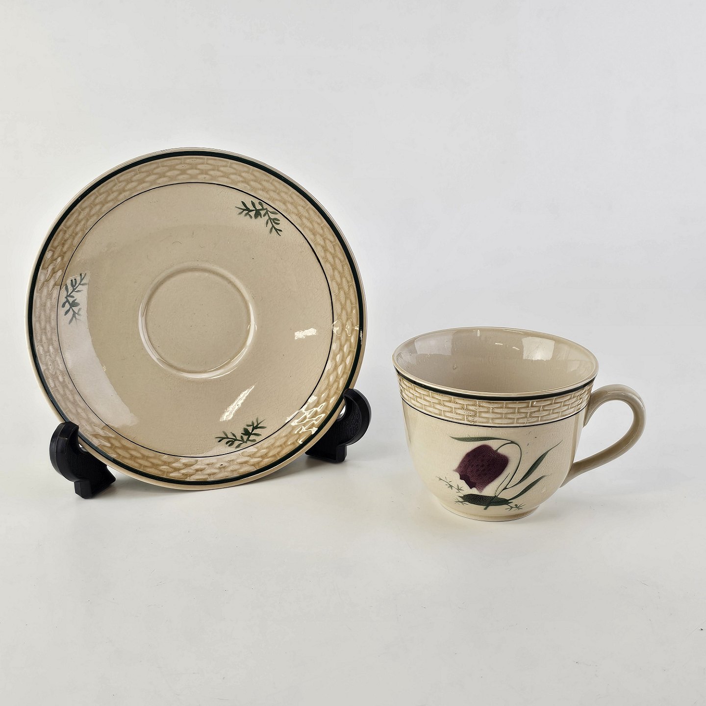 Fajancestel i stelform Viktoria II (Fletværk) med flettet kant og dekoration af en vibeæg blomst i violet og grøn, fremstillet i perioden 1934-1967