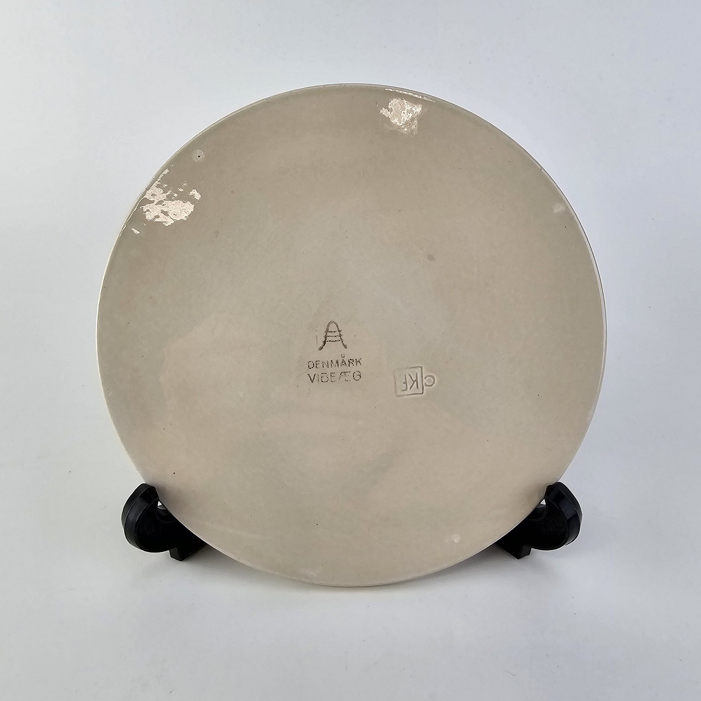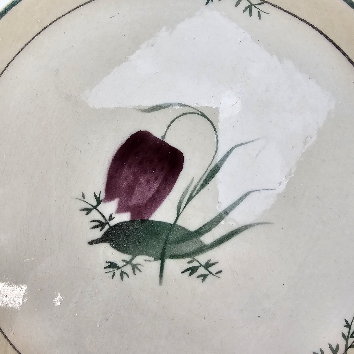 Fajancestel i stelform Viktoria II (Fletværk) med flettet kant og dekoration af en vibeæg blomst i violet og grøn, fremstillet i perioden 1934-1967