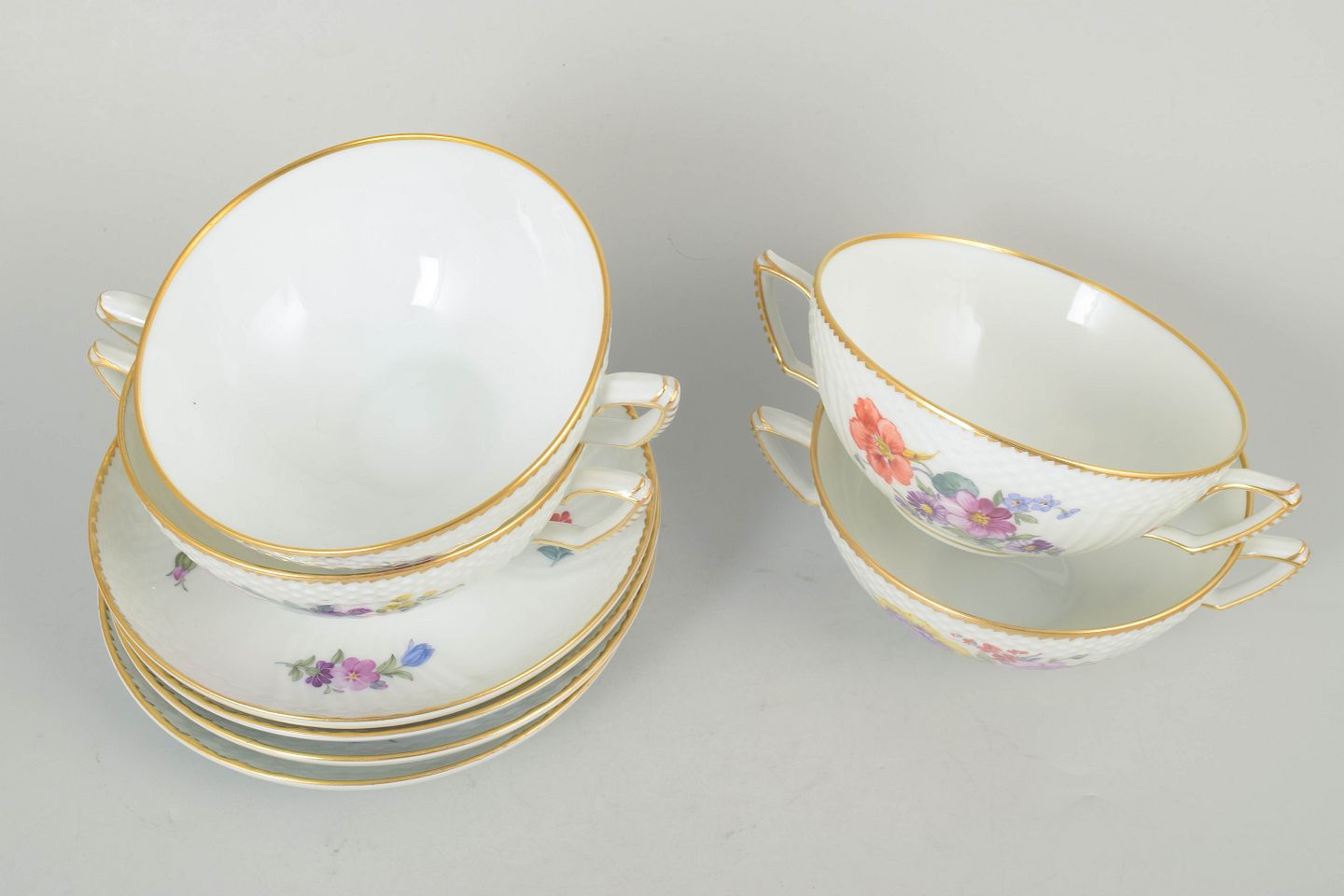 Sæt af fire bouillonkopper med tilhørende underkopper i porcelæn dekoreret med håndmalede blomster i saksisk blomst-mønster og afsluttet med forgyldt kant. Model 4/1872. 1. sortering.