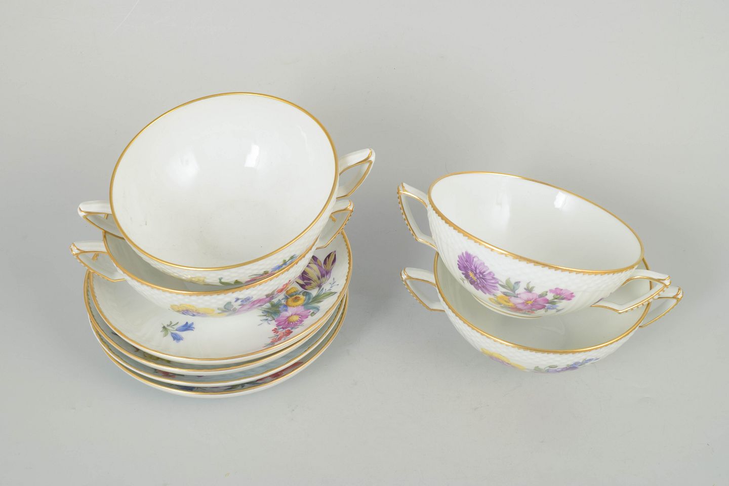 Sæt af fire bouillonkopper med tilhørende underkopper i porcelæn dekoreret med håndmalede blomster i saksisk blomst-mønster og afsluttet med forgyldt kant. Model 4/1872. 1. sortering.