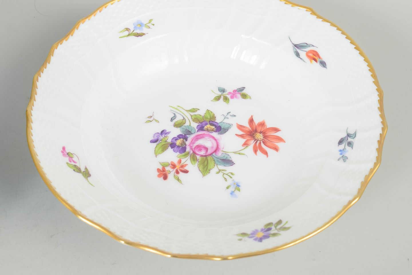Sæt af seks dybe tallerkner i porcelæn dekoreret med håndmalede blomster i saksisk blomst-mønster og afsluttet med forgyldt kant. Model 21/1616. 1. sortering.
