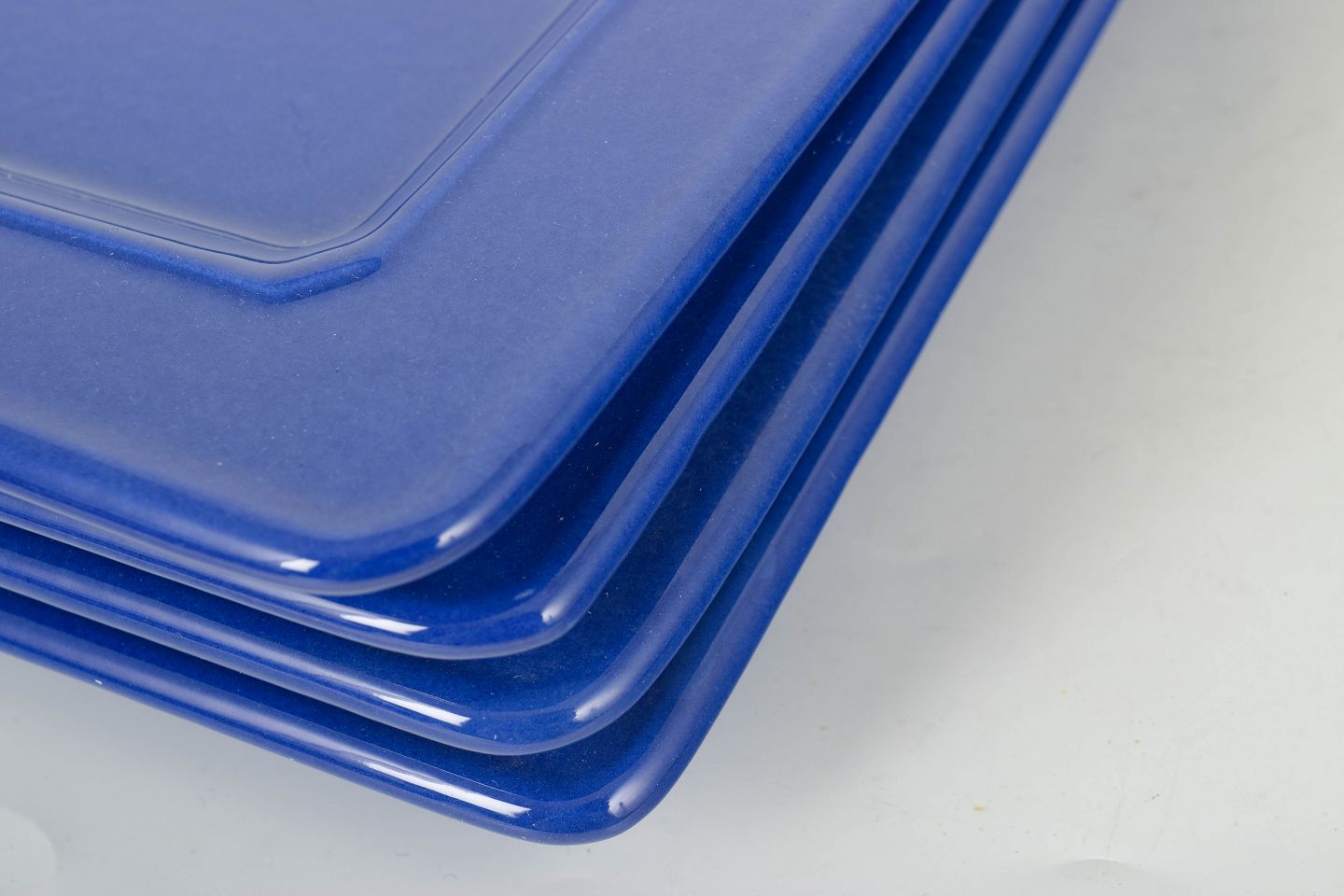 Minimalist set of glazed ceramic consisting of four large square plates in a uniform blue colour with a glossy finish.