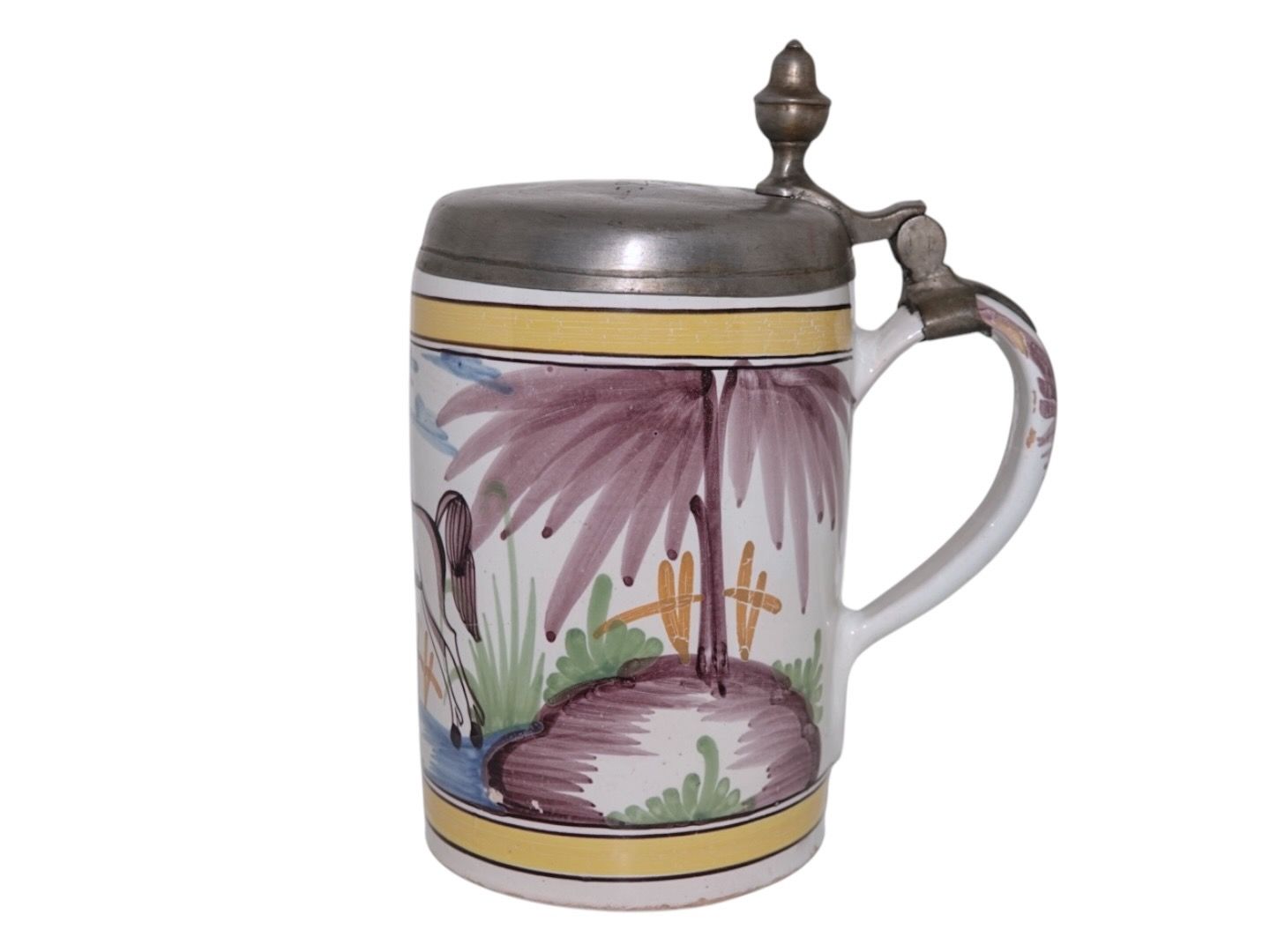 Stort fajance krus dekoreret med en hest. Der er et tinlåg der har senere inskription fra 1833. Kruset er fremstillet mellem 1790 og 1810.