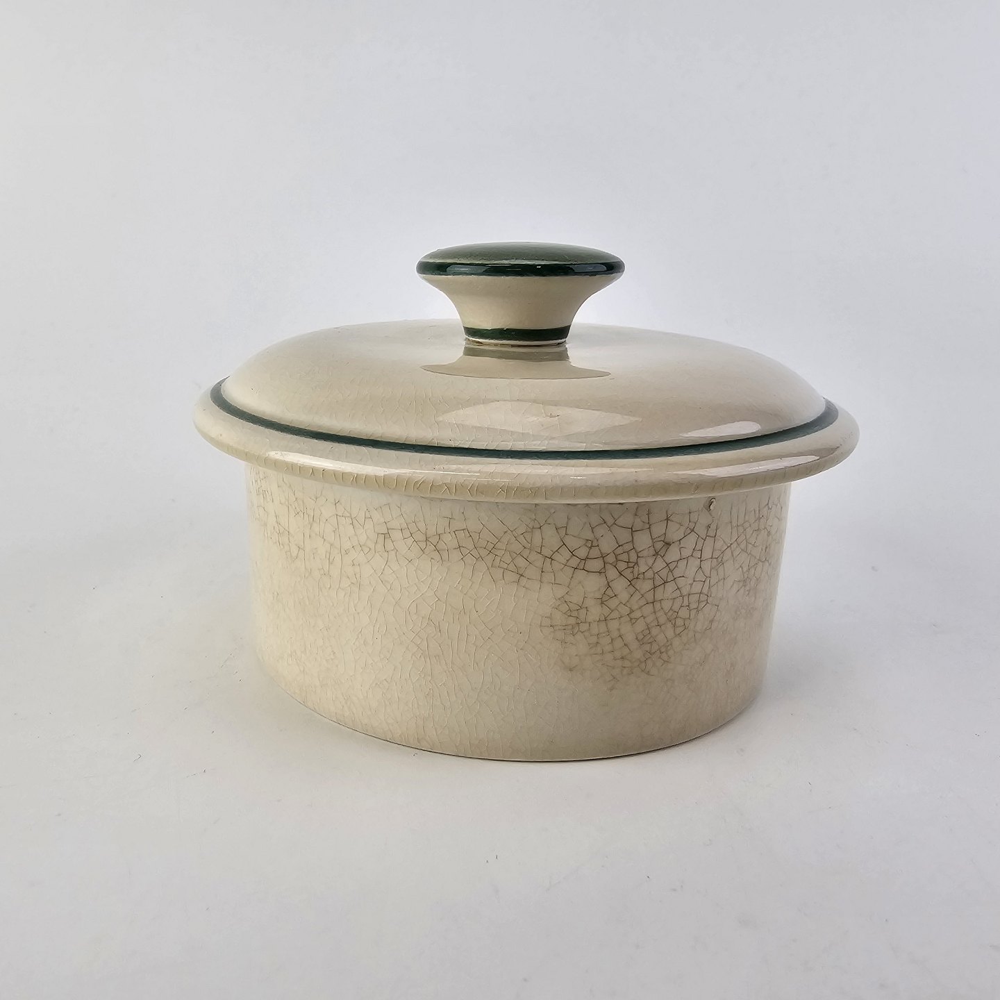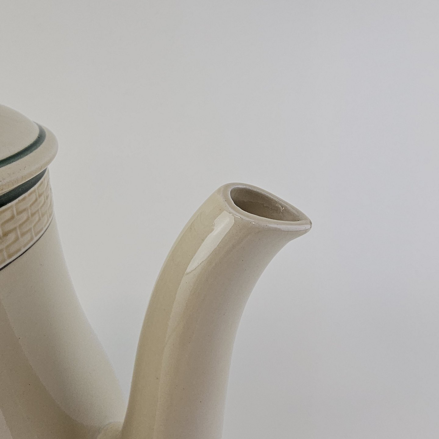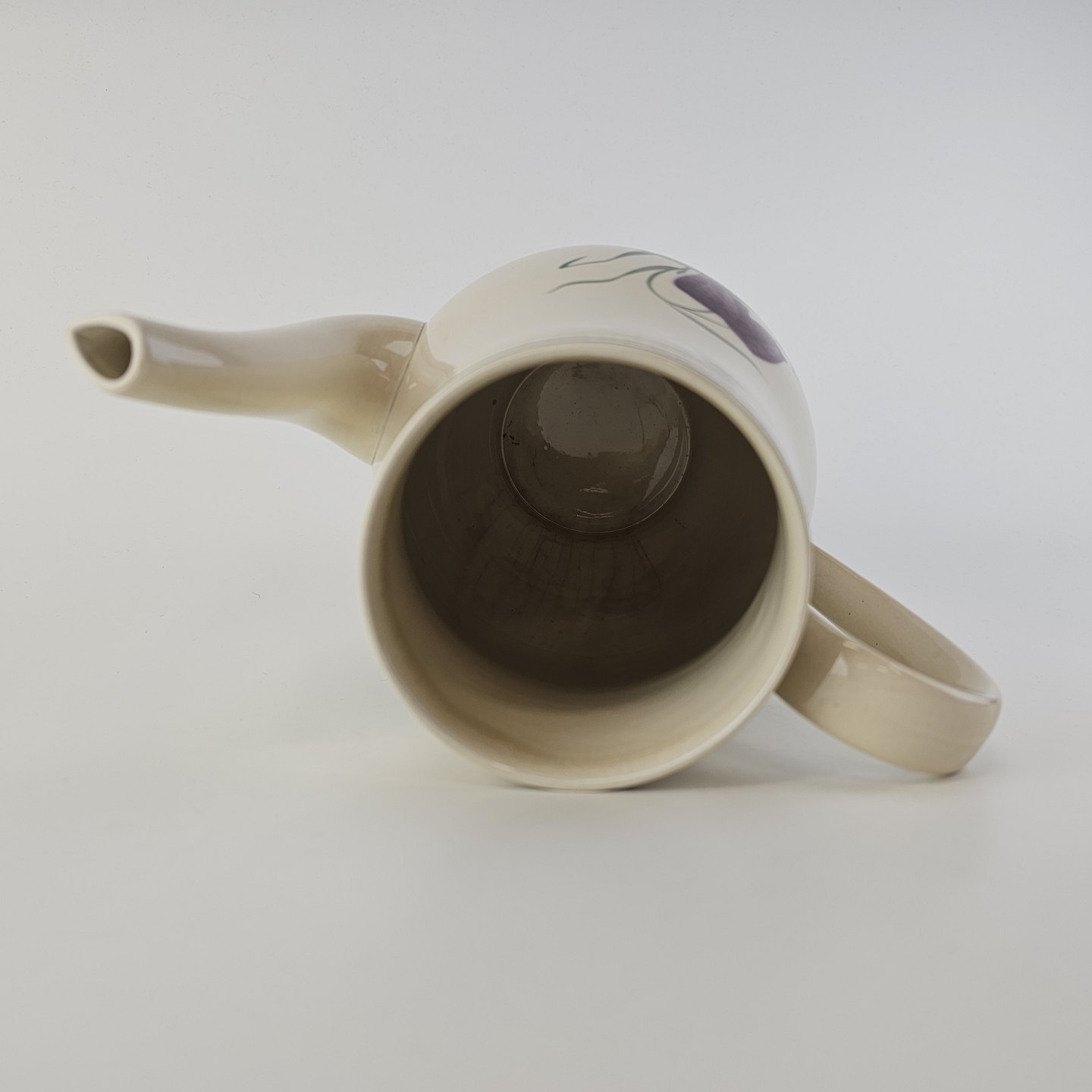 Fajancestel i stelform Viktoria II (Fletværk) med flettet kant og dekoration af en vibeæg blomst i violet og grøn, fremstillet i perioden 1934-1967