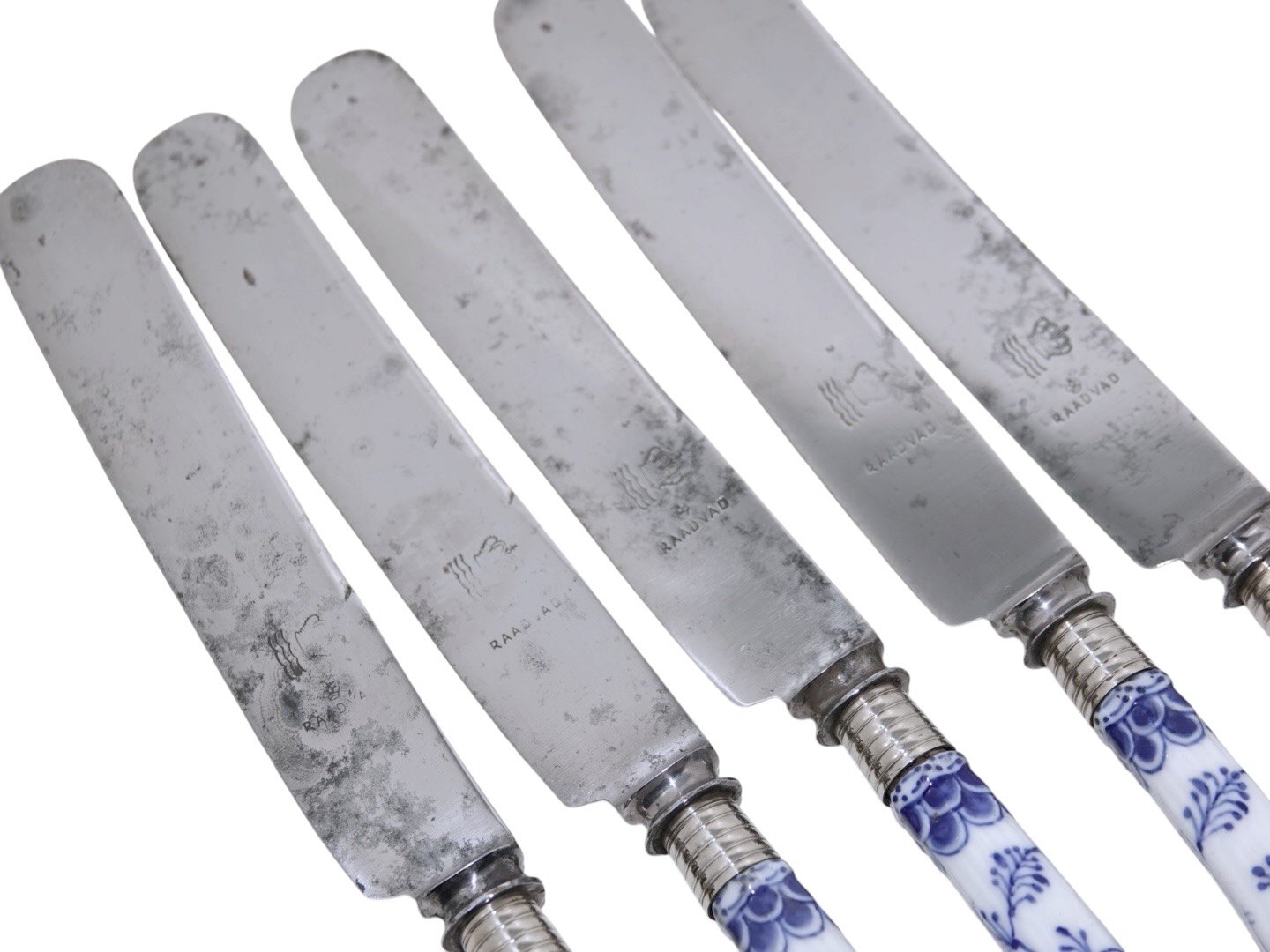 Royal Copenhagen Musselmalet Halvblonde, middagskniv med pistolskaft og originalt Raadvad knivblad.