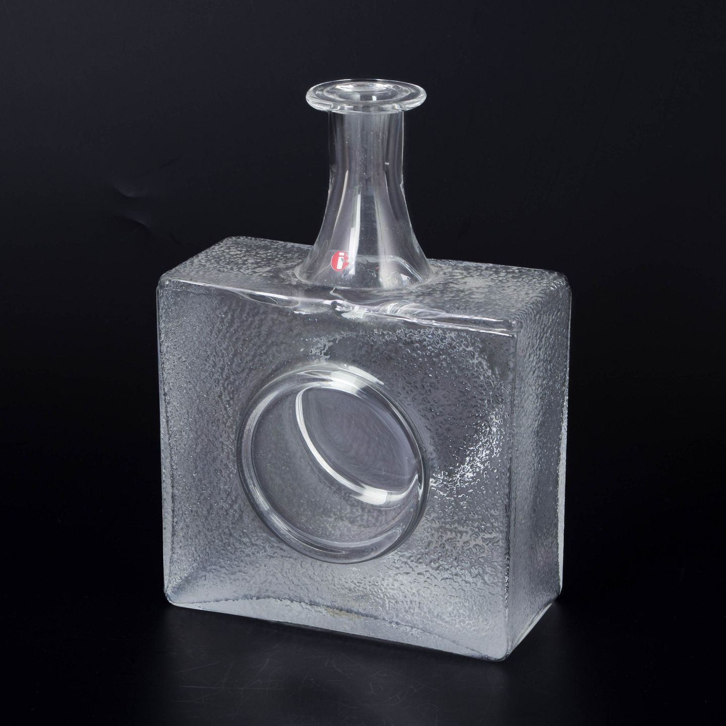 Kraftig kvadratisk glasflaske med integreret rund fordybning på fronten og kort hals. Udført i klart glas med let rå struktur på siderne. Original producentmærkat bevaret.