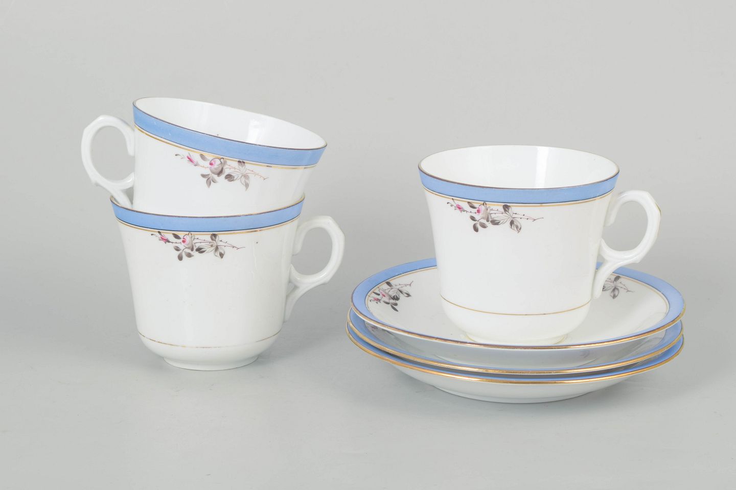 Elegant porcelænssæt med lyseblå kant og fin blomsterdekoration. Model “Carlstad” fremstår med klassisk formsprog fra perioden.