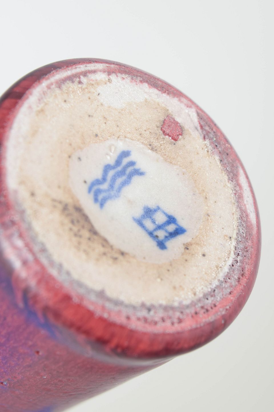 Slank og cylindrisk lysestage udført i keramik med dyb rød okseblods glasur og klassisk form. Fremstår som et unikt stykke med elegant proportionering og karakteristisk glasurspil. Første sortering.