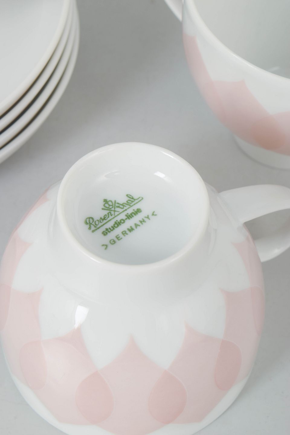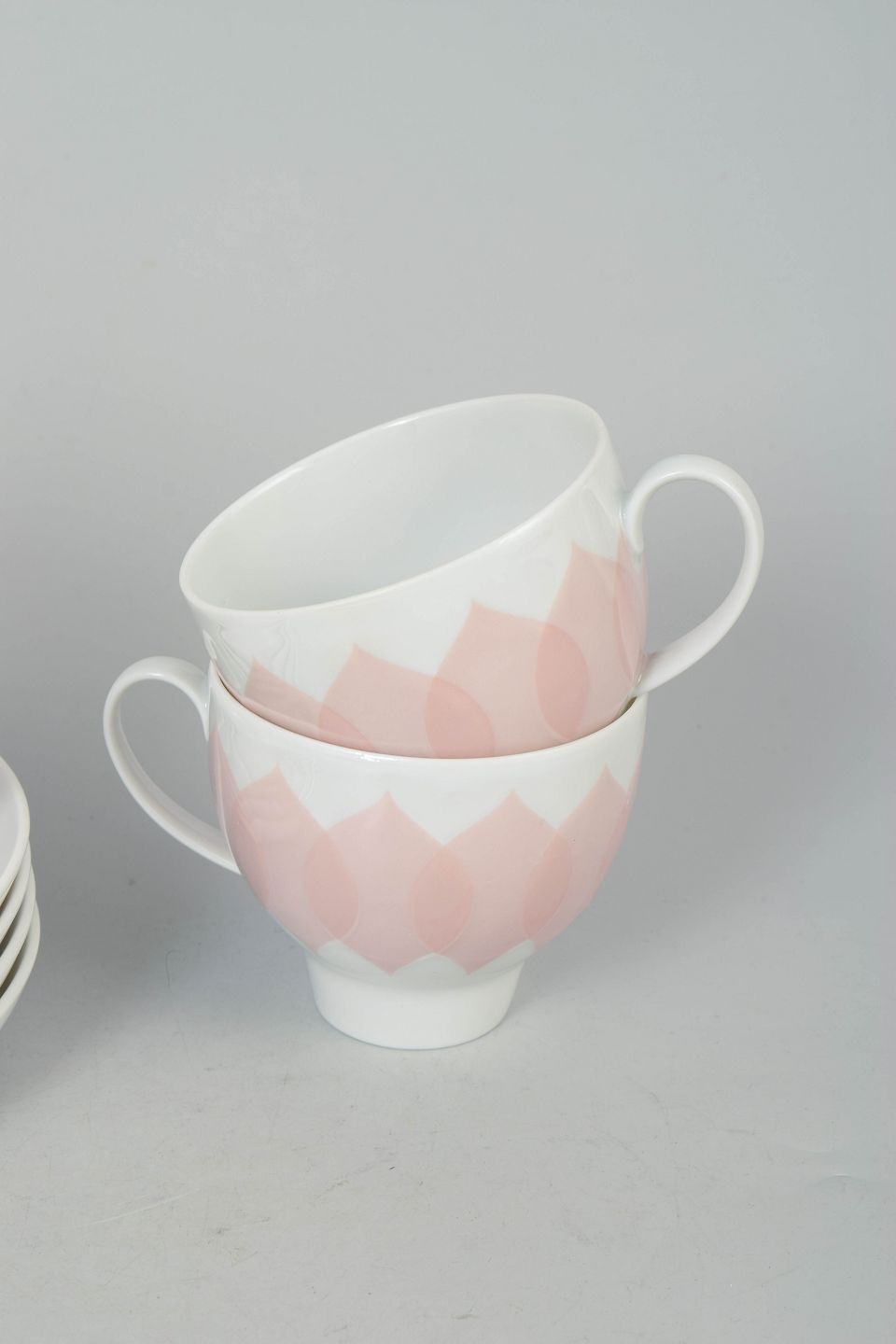 Sæt bestående af fire kaffekopper med matchende underkopper i porcelæn med rosa “Lotus” dekoration, udført med gentaget bladmotiv i bløde nuancer og et karakteristisk dekorativt udtryk.