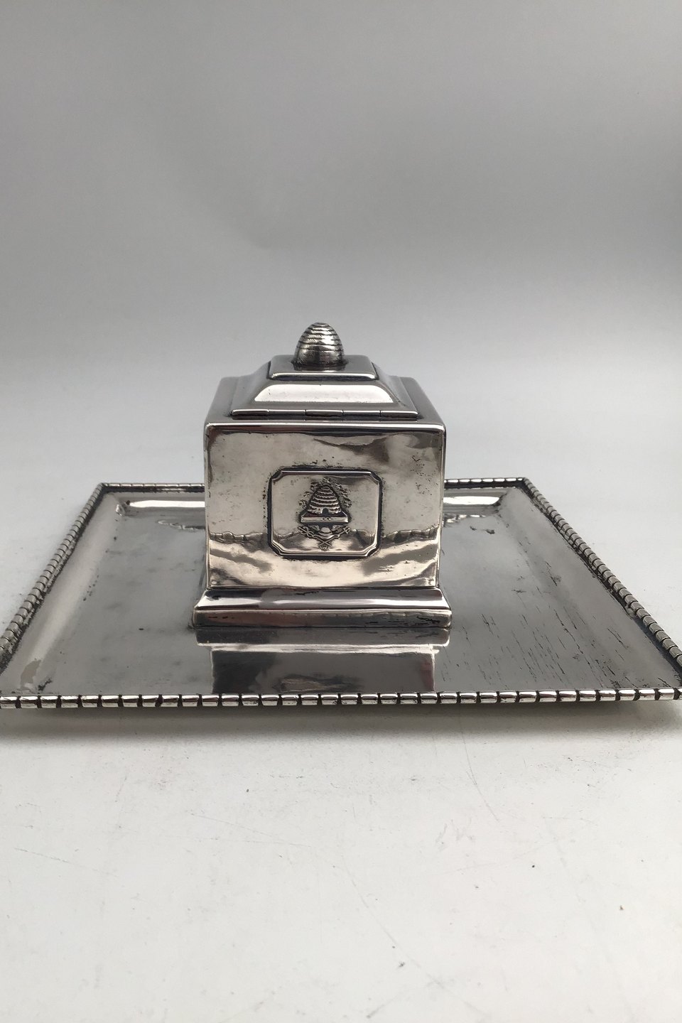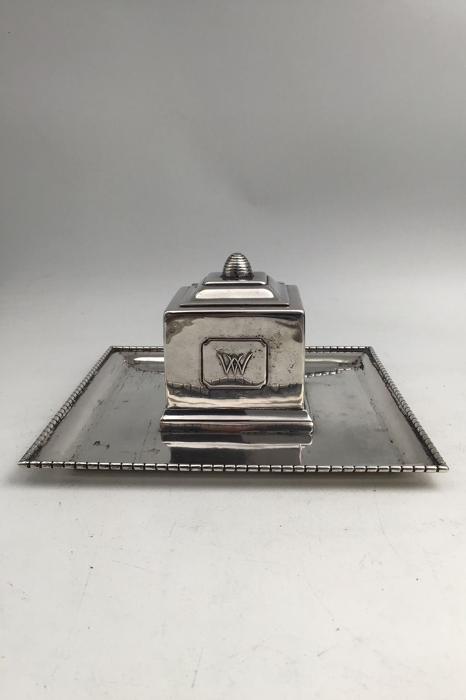 Mogens Ballin Eftf. Sølv Blækhus No. 144 Måler 18 cm x 18 cm (7.08 inch x 7.08 inch) H 9 cm (3.54 inch) Vægt 518 gram / 18.27 oz (uden glas indsats) Bærer Monogram for Wessel&Vett, stiftere af stormagasinet Magasin