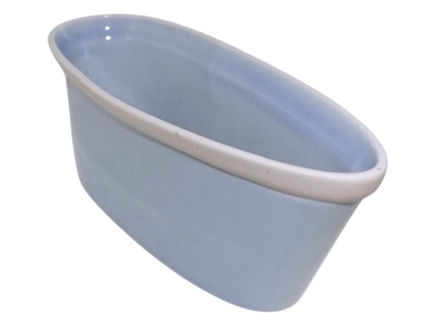 Bodil Manz keramik, bådformet lyseblå skål med hvid stribe.