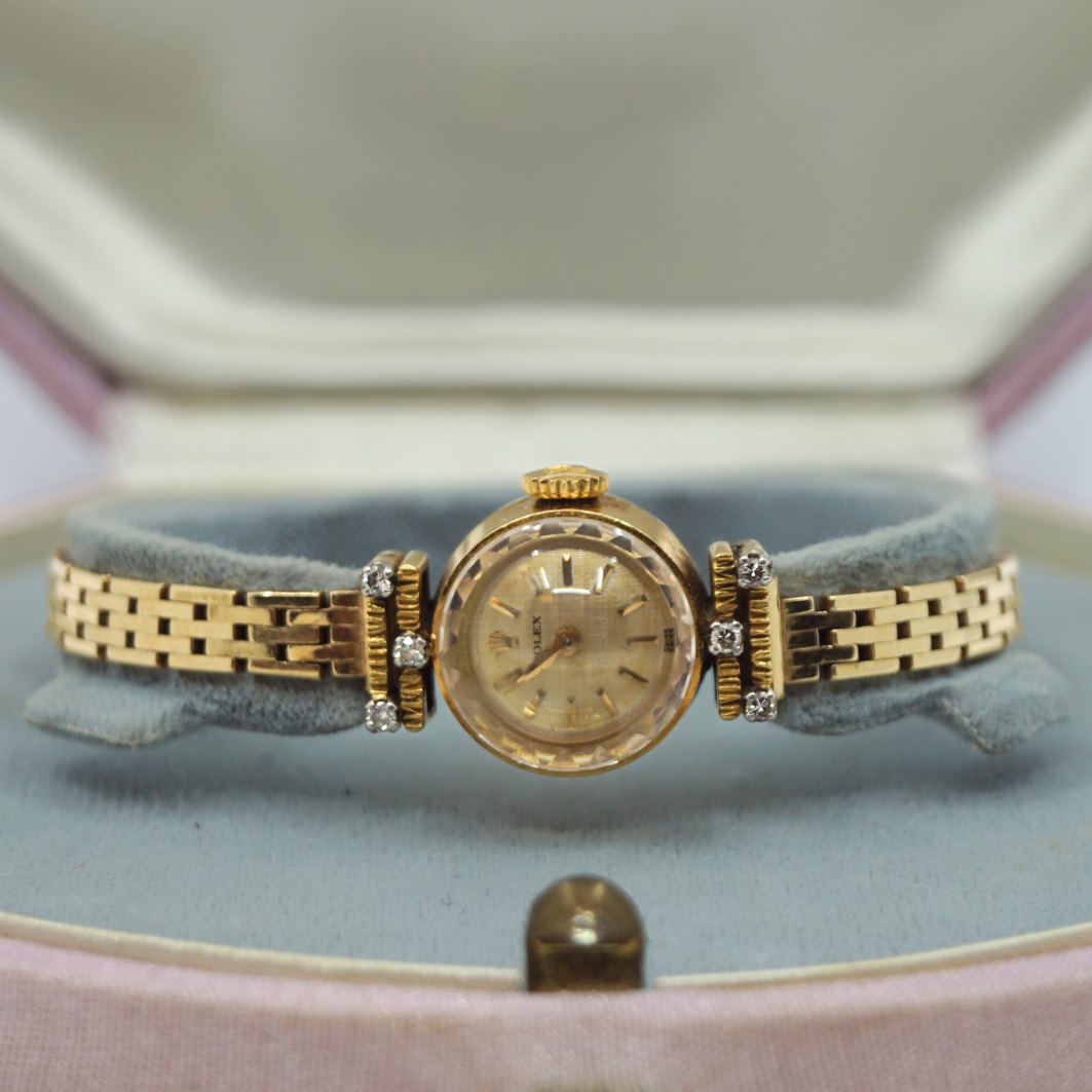 Rolex; Orchid dameur af 18 kt. guld, prydet med seks diamanter sat i hvidguld. Ref. 988531. Lænke i 14 kt. guld i murstenmønster. Kasselås med 2 sikkerhedslåse.