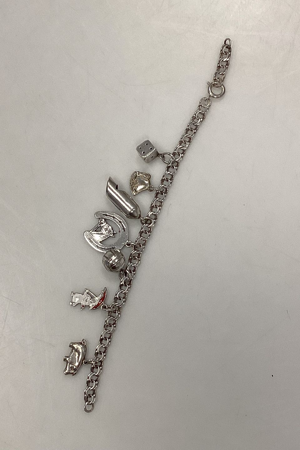 Dansk Bismarck armbånd i sterling sølv med forskellige vedhæng, Terning, Alpehat, Fløjte, Hestesko, Bold, Pige med paraply, og Gris
