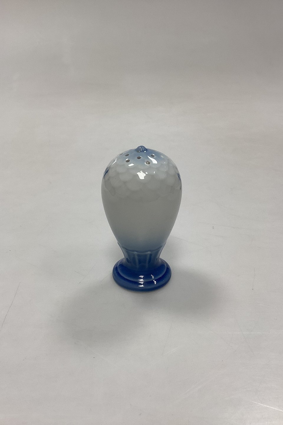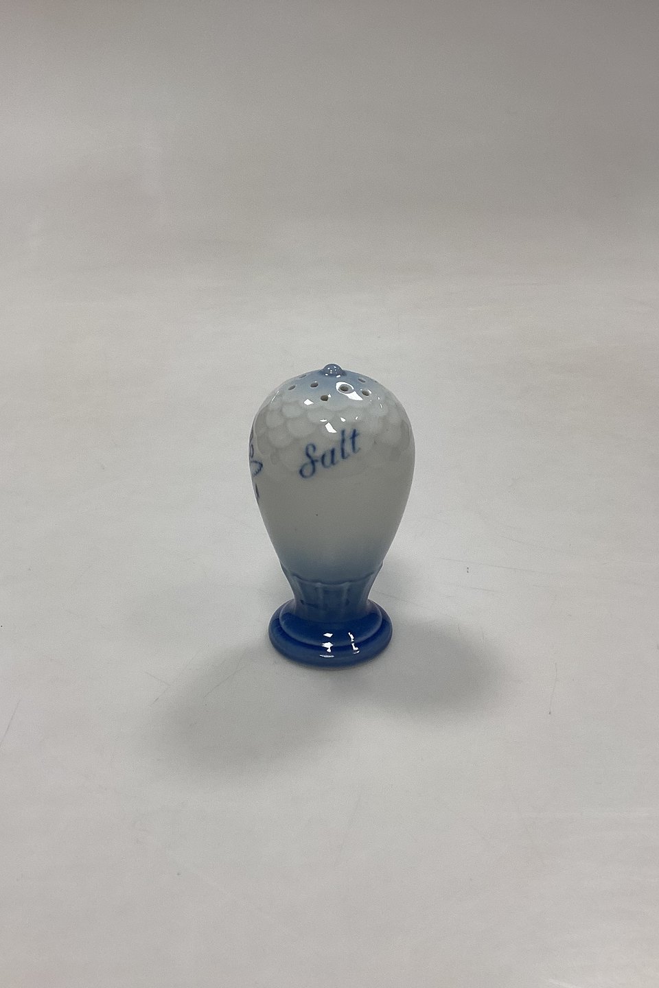 Bing og Grøndahl Blå Tone Saltbøsse No. 52 A med Logo. Logo med krone, hjul med vinger og ankre er højst sandsynligt fra et shippingfirma.