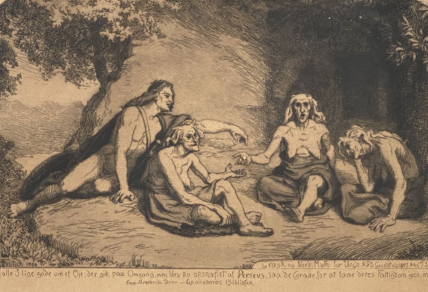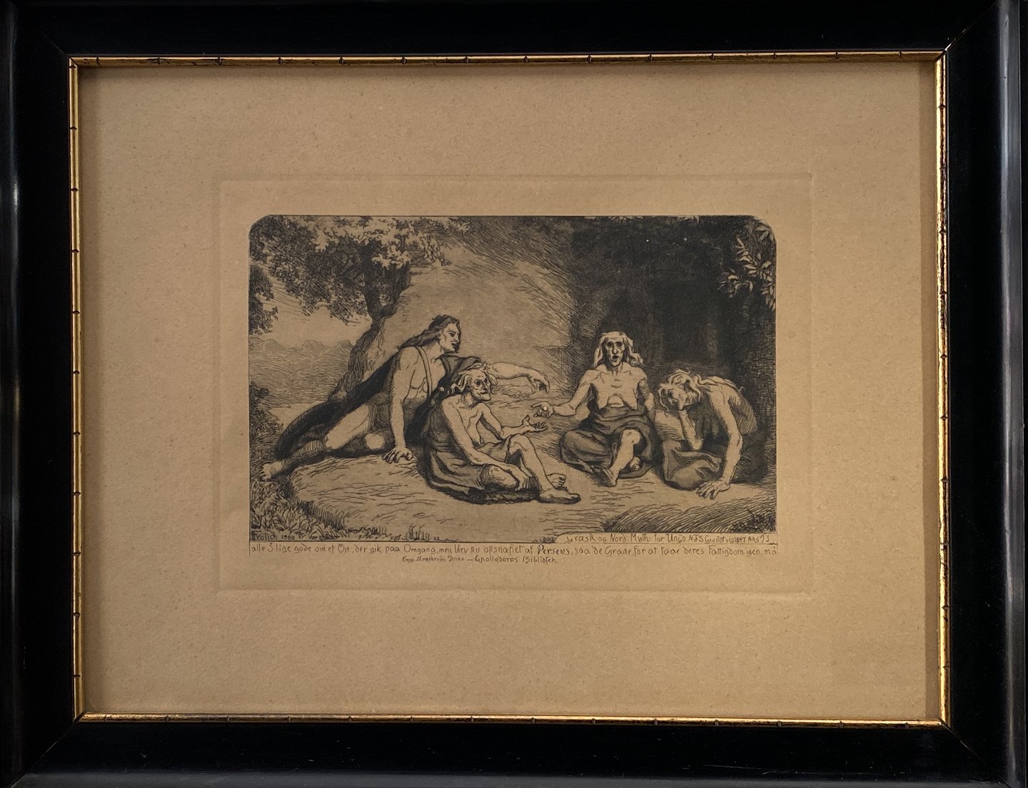 Johannes Frederik Fröhlich. Motiv fra Grundtvig Græsk og nordisk mytologi. Original radering med passepartout i sort ramme.