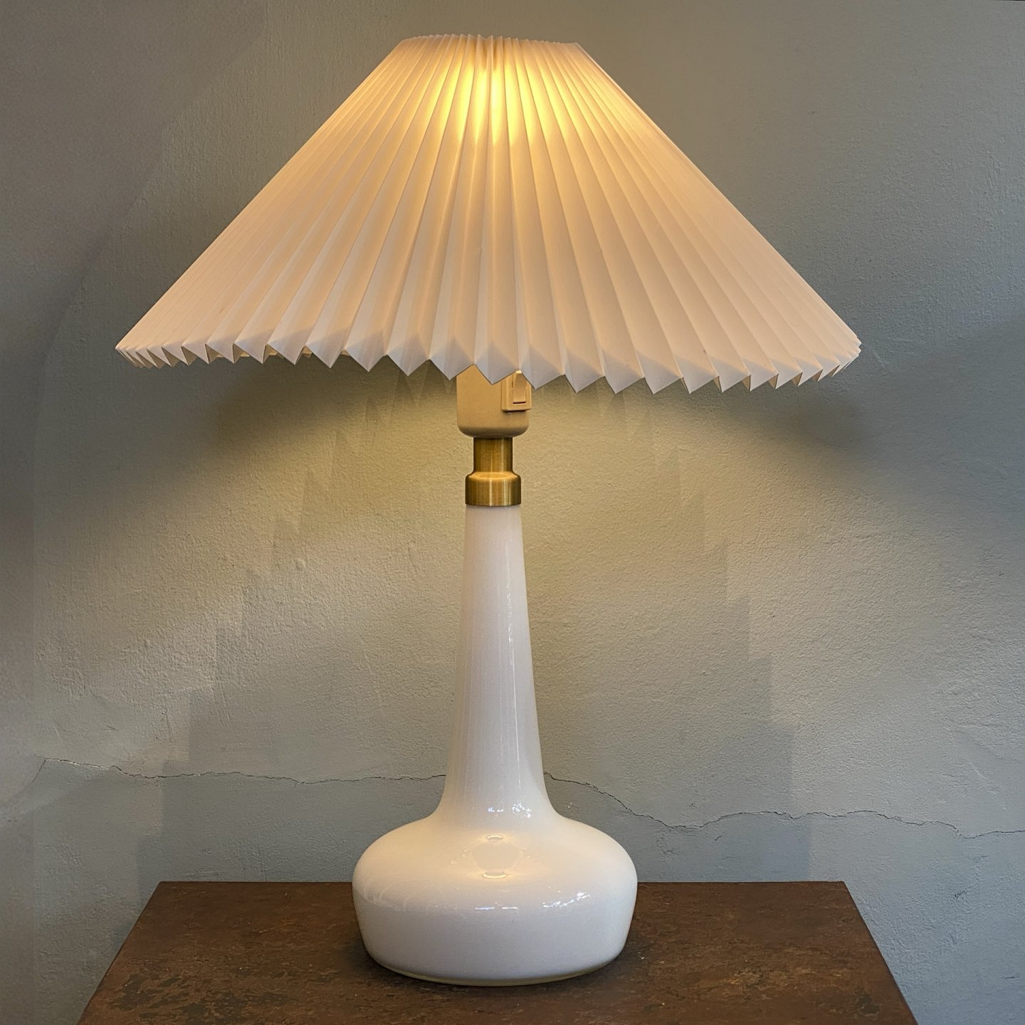 Le klint bordlampe model 311 med lampefod af hvid opalineglas.den viste lampe er solgt , men vi har flere dog uden skærm.