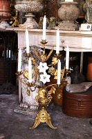 Antik , franske kirkelysestage i forgyldt metal dekoreret med 6 metalblomster med farvet sten. . .