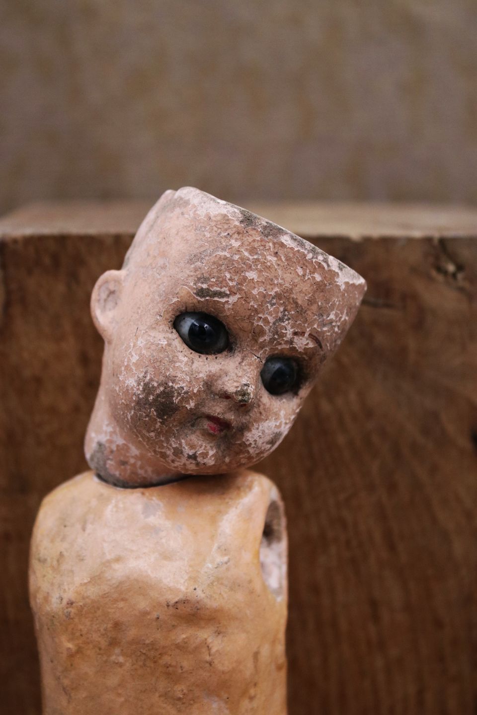 Gammel fransk 1800 tals dukke , hoved med glas øjne , krop og ben i bemalet papmache med en fin gammel patina. H: 31cm.
