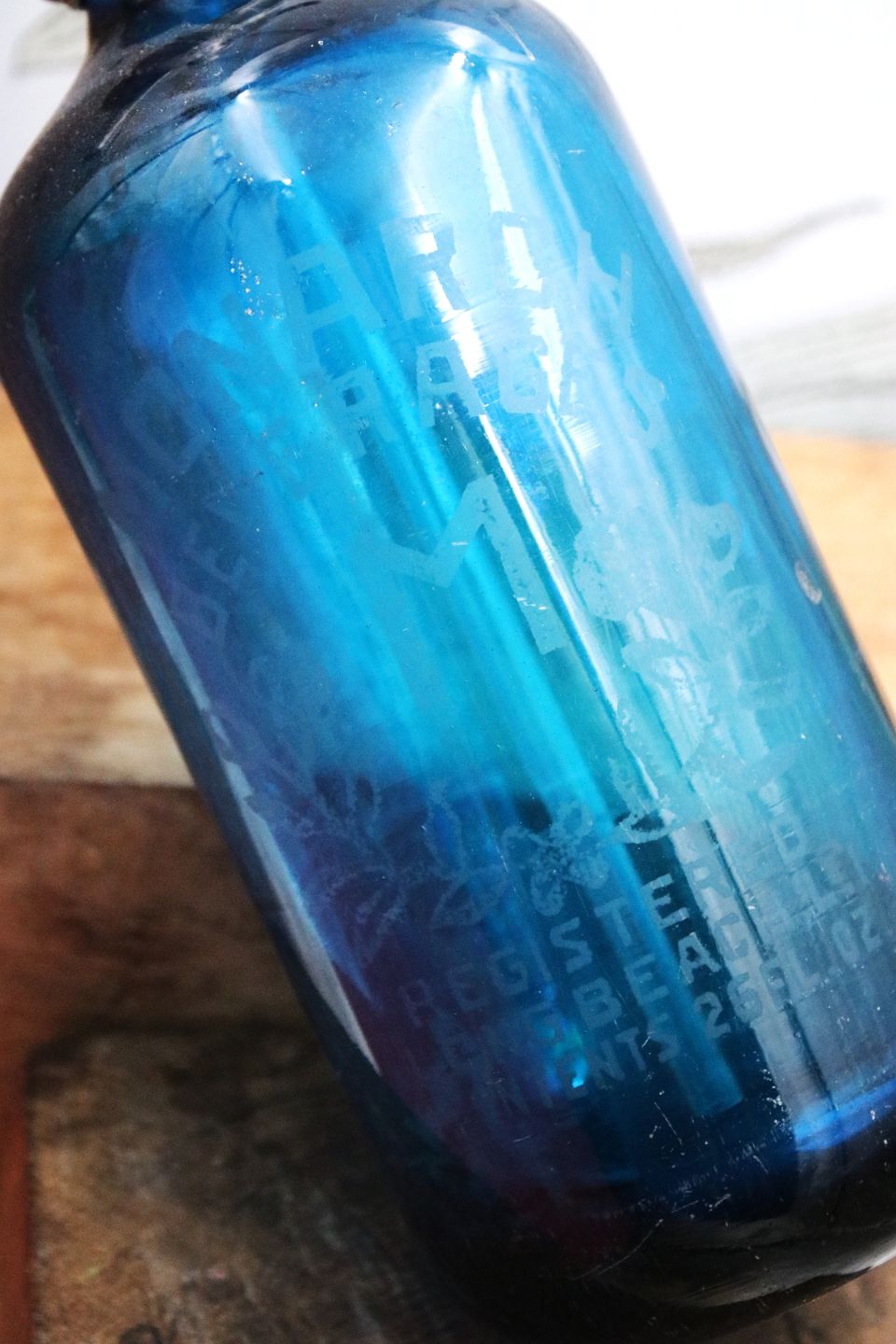 Dekorativ , gammel fransk glas sifon i blå farve med graveret skrift på siden af sifonen. H: 28cm.