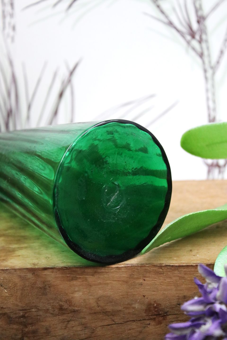 Antikt grønt hyacintglas i mundblæst glas fra Holmegaard glasværk. H: 21cm. Dia.: 7,5cm. Emne nummer: Hyacintglas Grøn